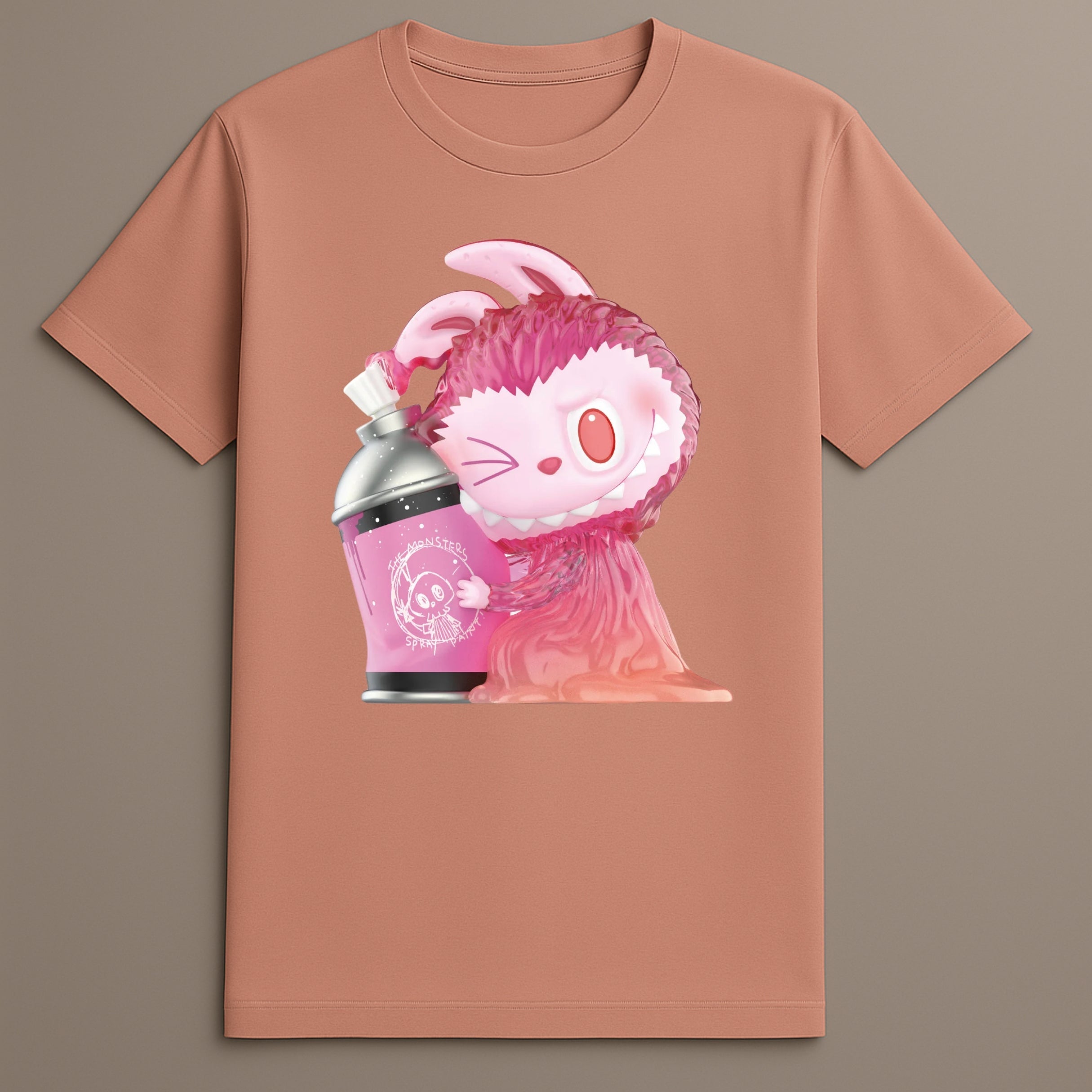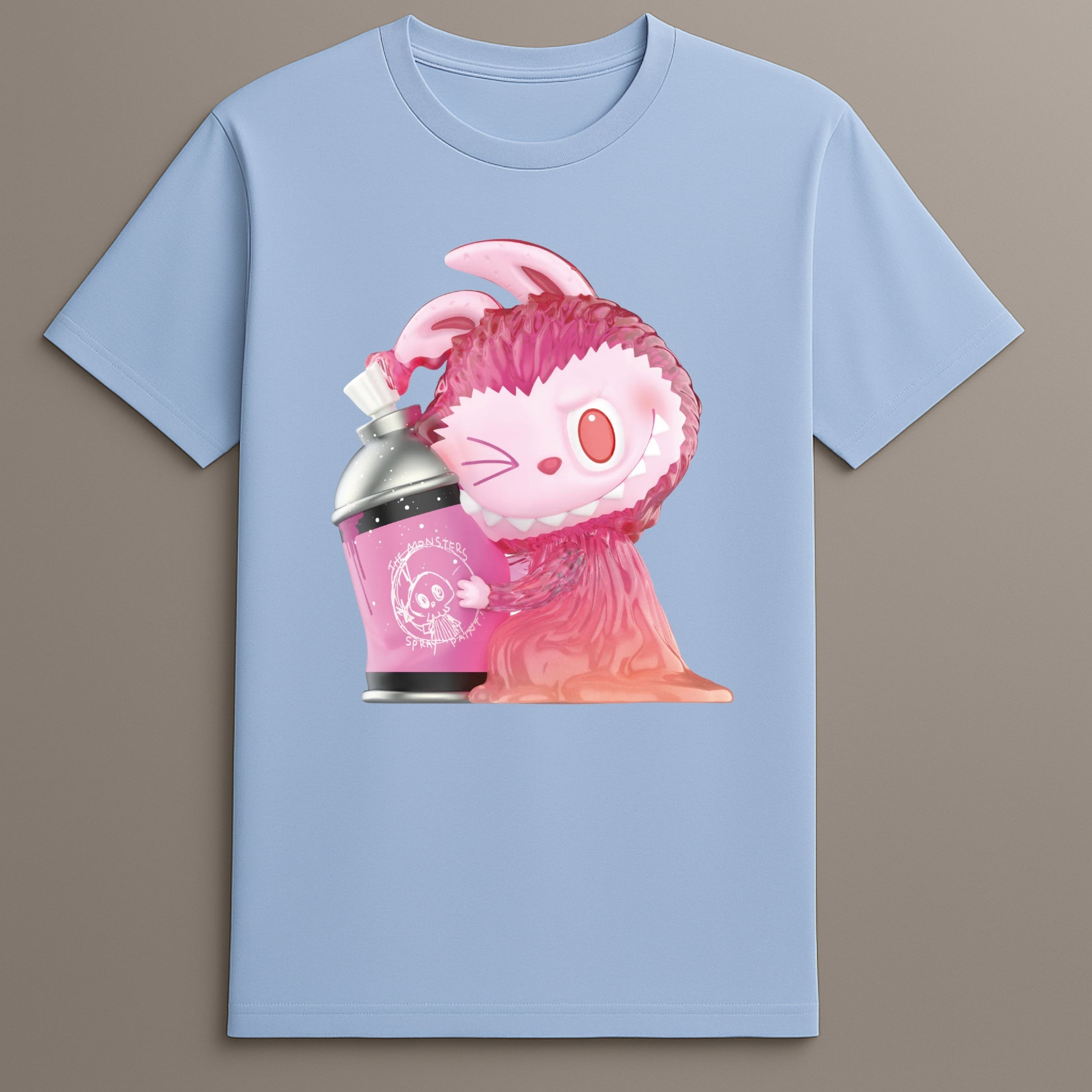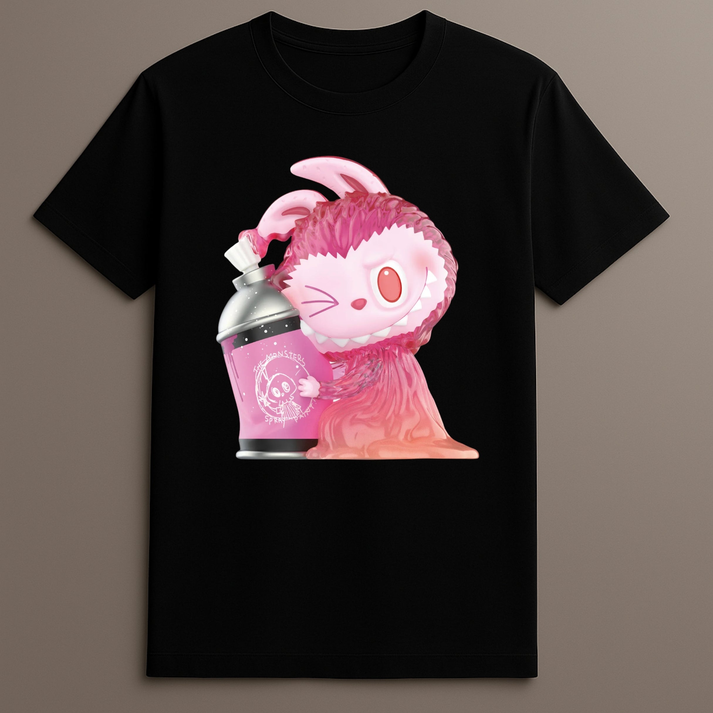 The central artwork showcases Labubu, posed with a tilted expression, holding a bright pink spray can. The character’s vibrant fur, expressive face, and dynamic pose capture the spirit of spontaneous creativity—fitting for a graffiti-inspired tee.