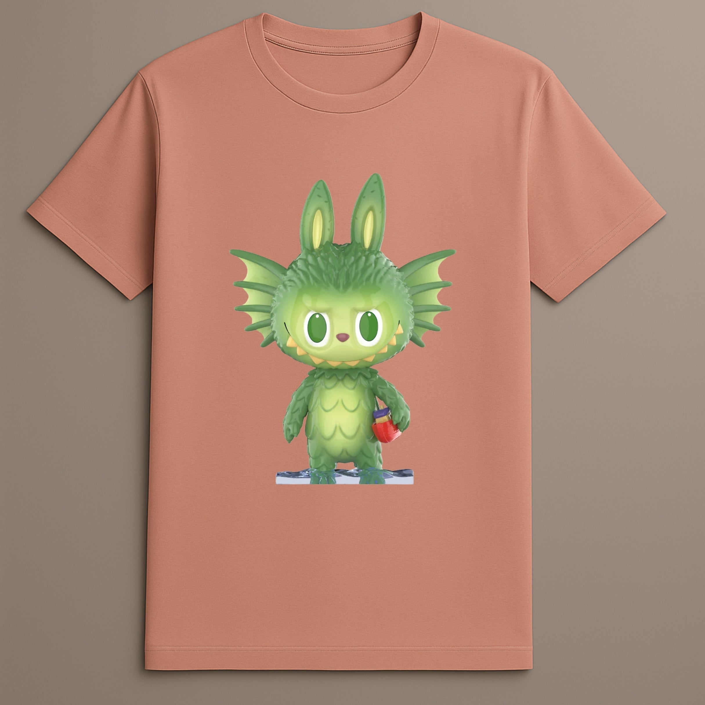 Main Graphic: Features a green monster character tee design based on Labubu in full Kaiju form. The centered artwork presents sharp contrast and color alignment for clear visibility and crisp edges.