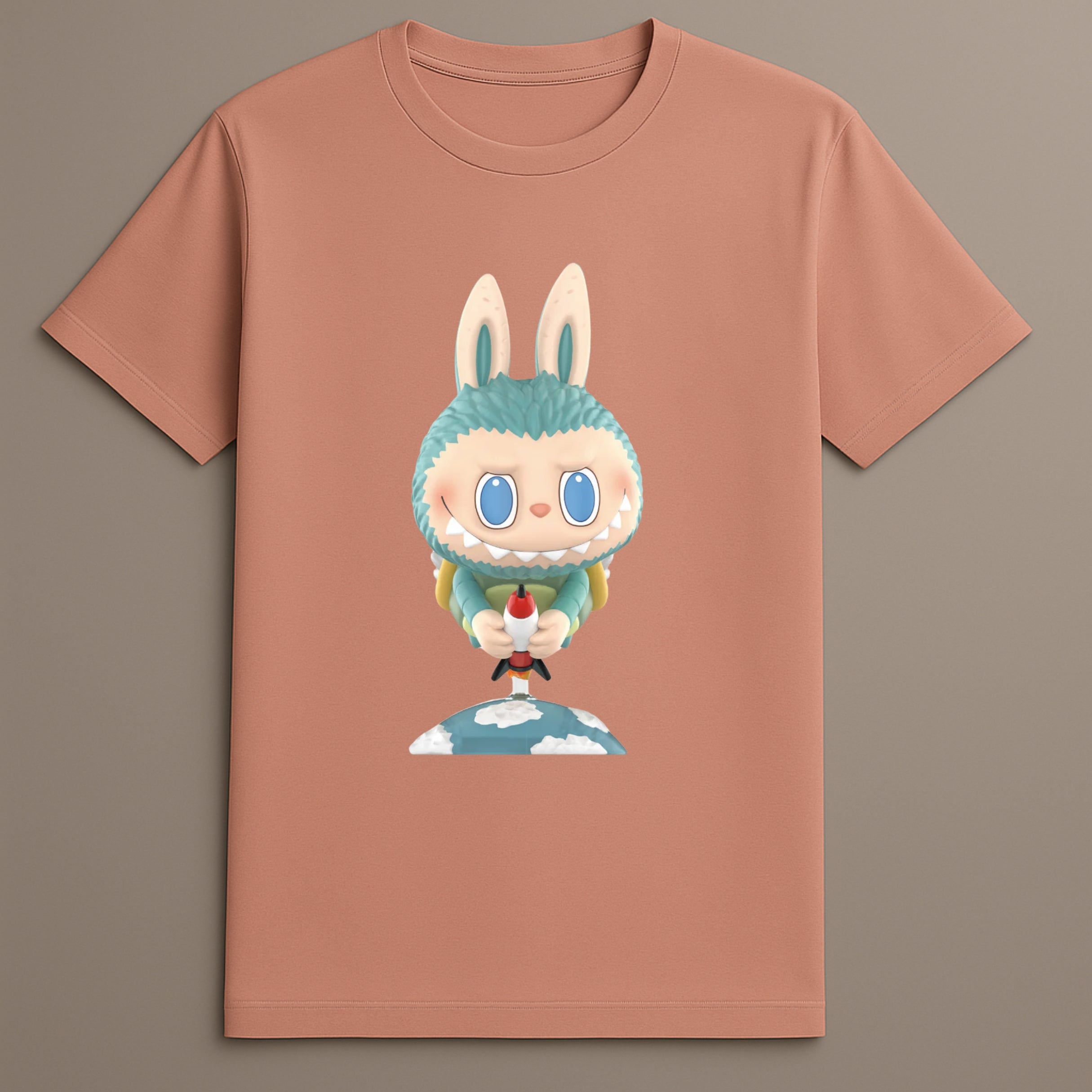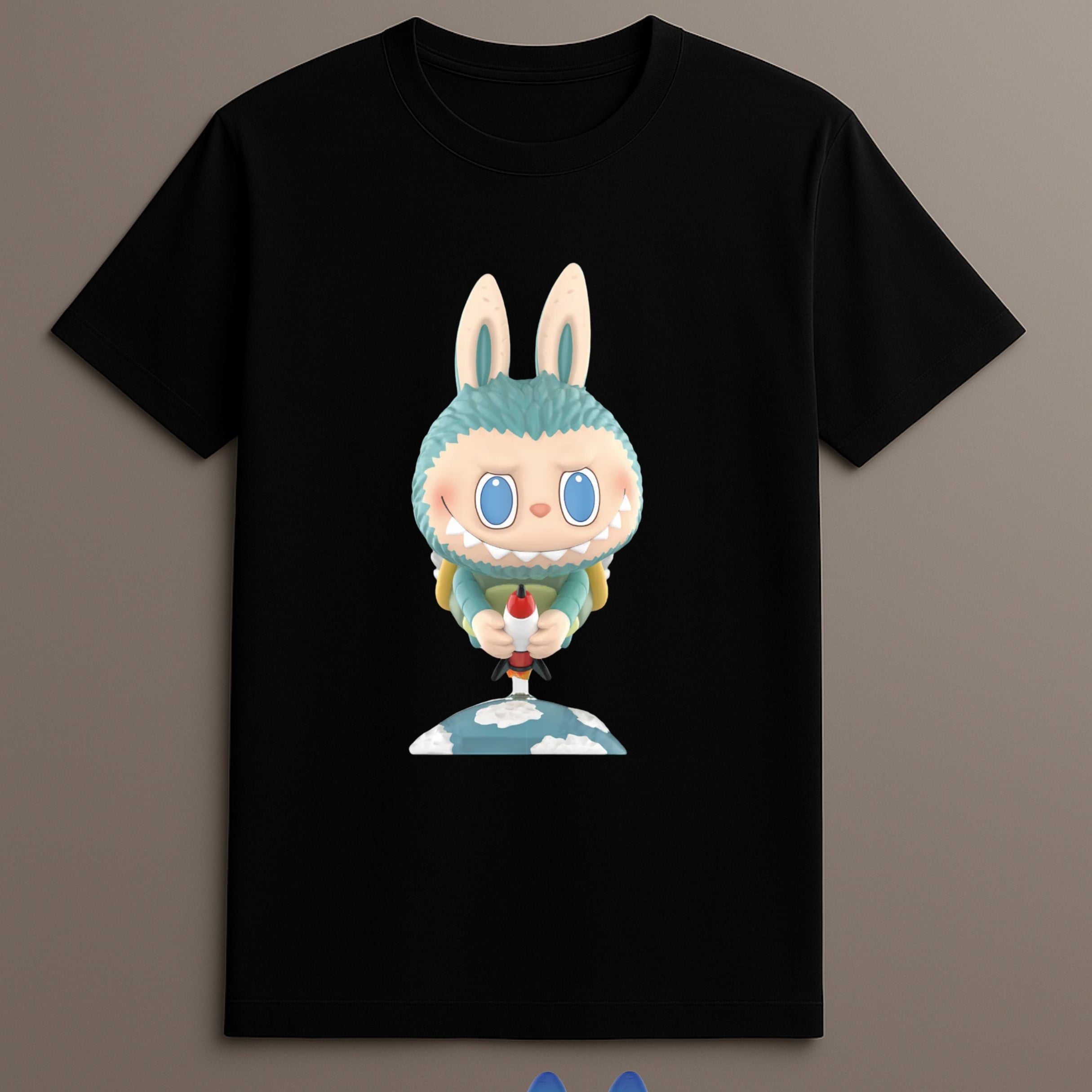 Monster character print: Center-placed artwork of Labubu holding a rocket and standing above the clouds.
