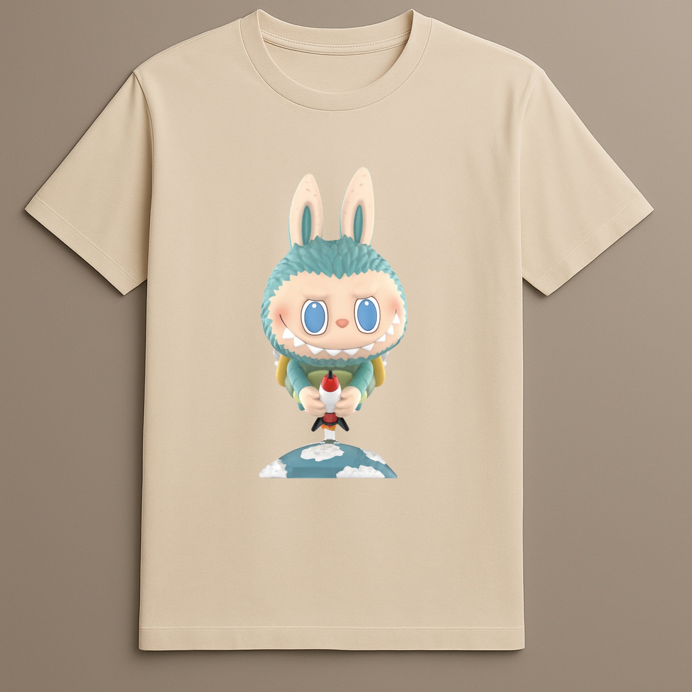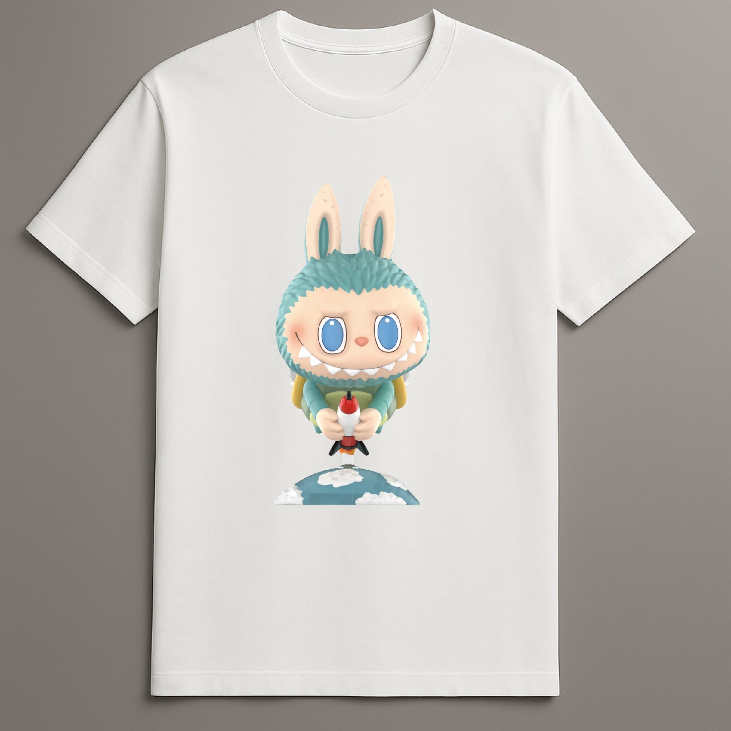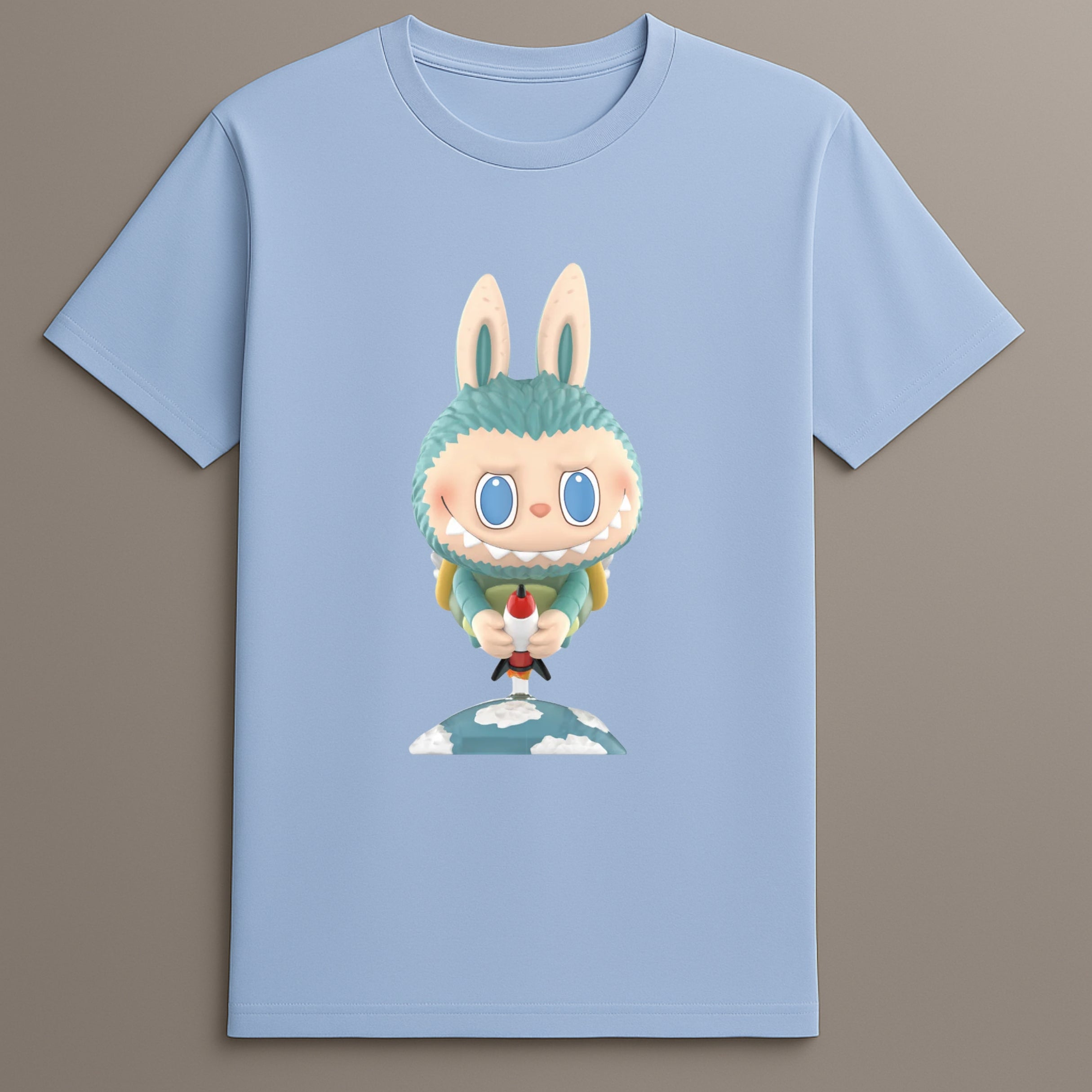 The Labubu Kaiju Series Monster Character Graphic Tee introduces collectible-inspired design into everyday fashion. Featuring a distinct monster bunny character with pointed rocket, the artwork draws from Labubu’s Kaiju series and places it within a skybound concept. The character stands above a cloud-patterned surface, bringing dimension and character-based art into streetwear.