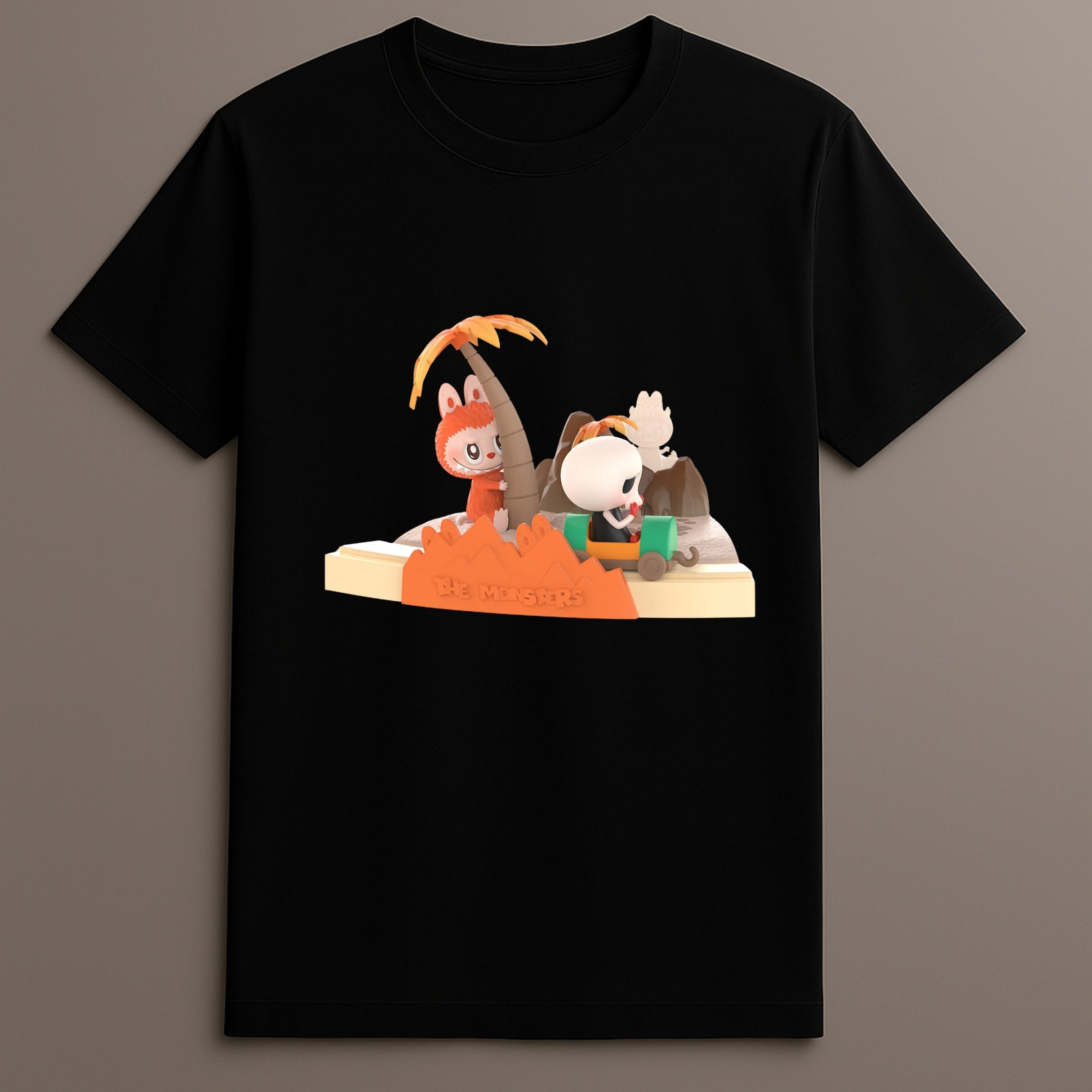 Inspired by the Monsters series tropical design, this T-shirt is a part of the collectible fashion category from Pop Mart’s popular releases. The shirt captures a fun, animated scene set in an island backdrop—complete with natural elements, character illustration, and a sense of motion.
