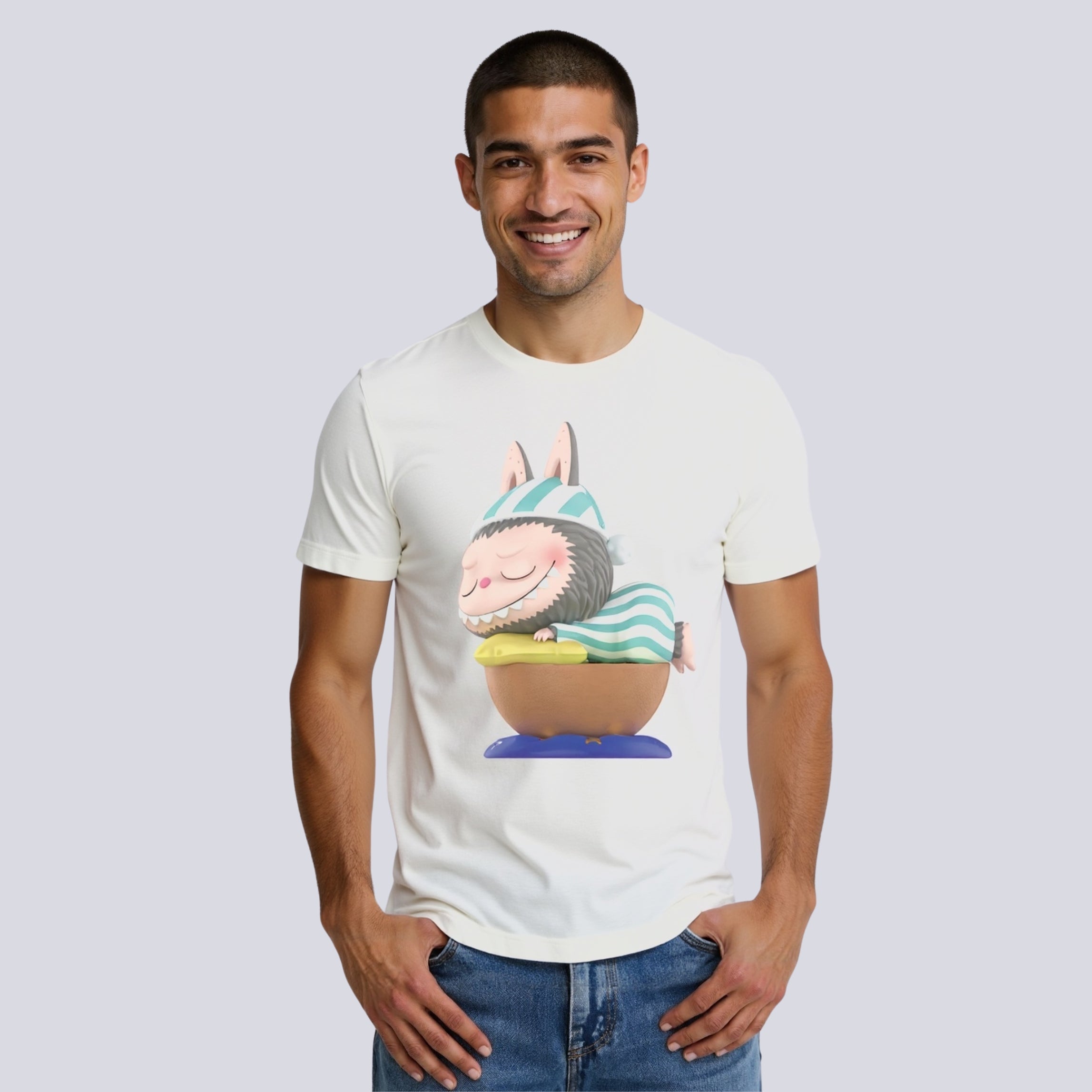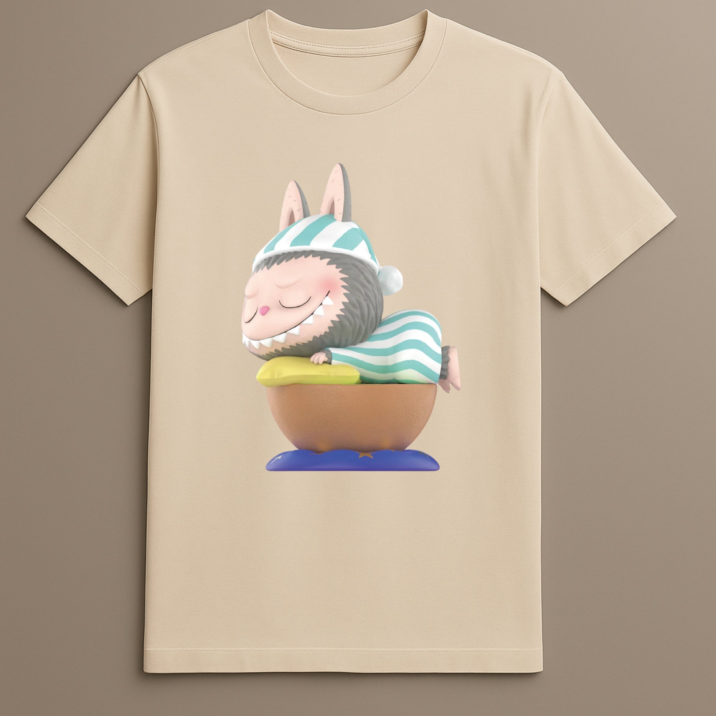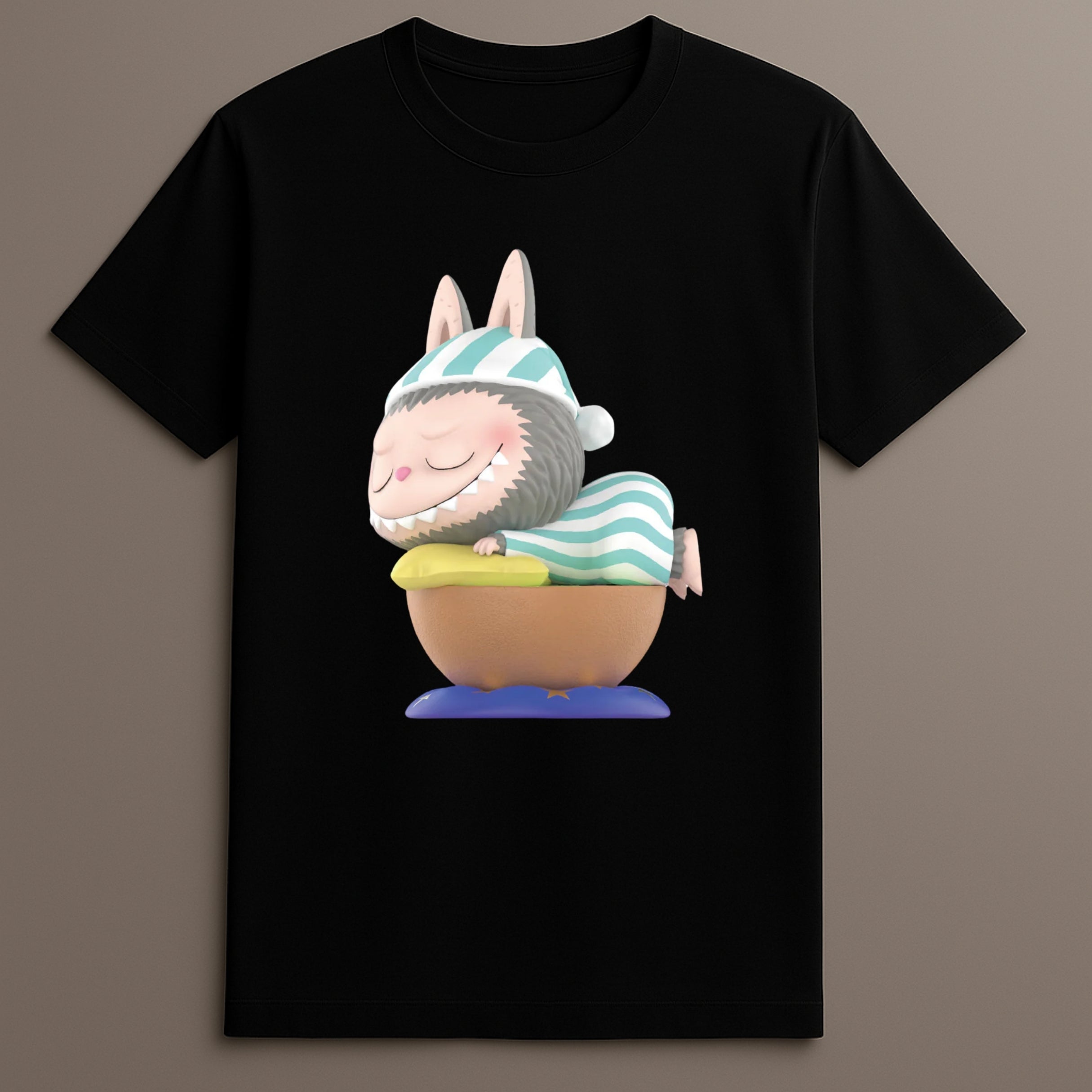 Character Graphic Shirt: The standout graphic sits centered on the front. Labubu’s sleepy expression and cozy pose give the shirt its charm. The character graphic shirt brings soft comic styling to daily fashion.