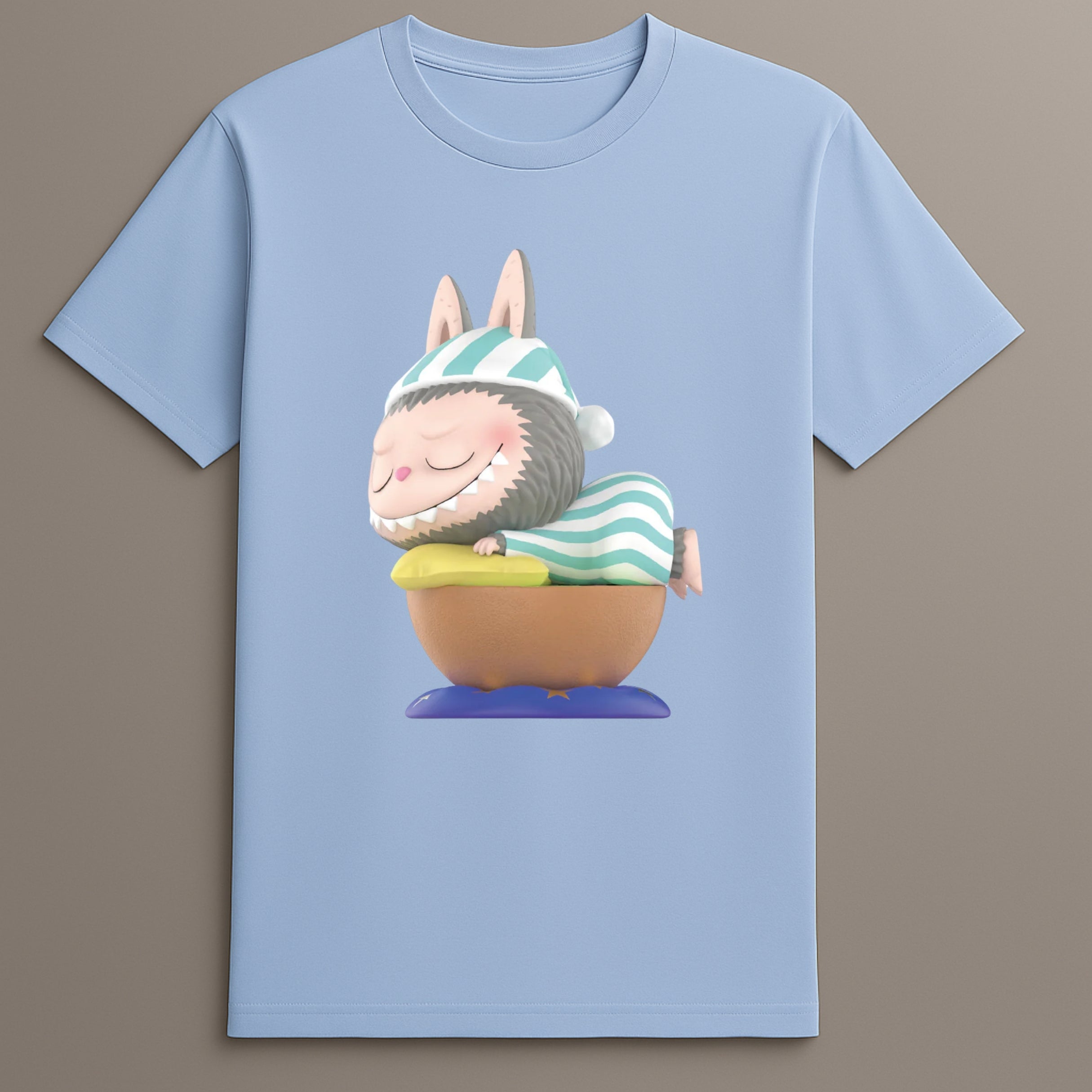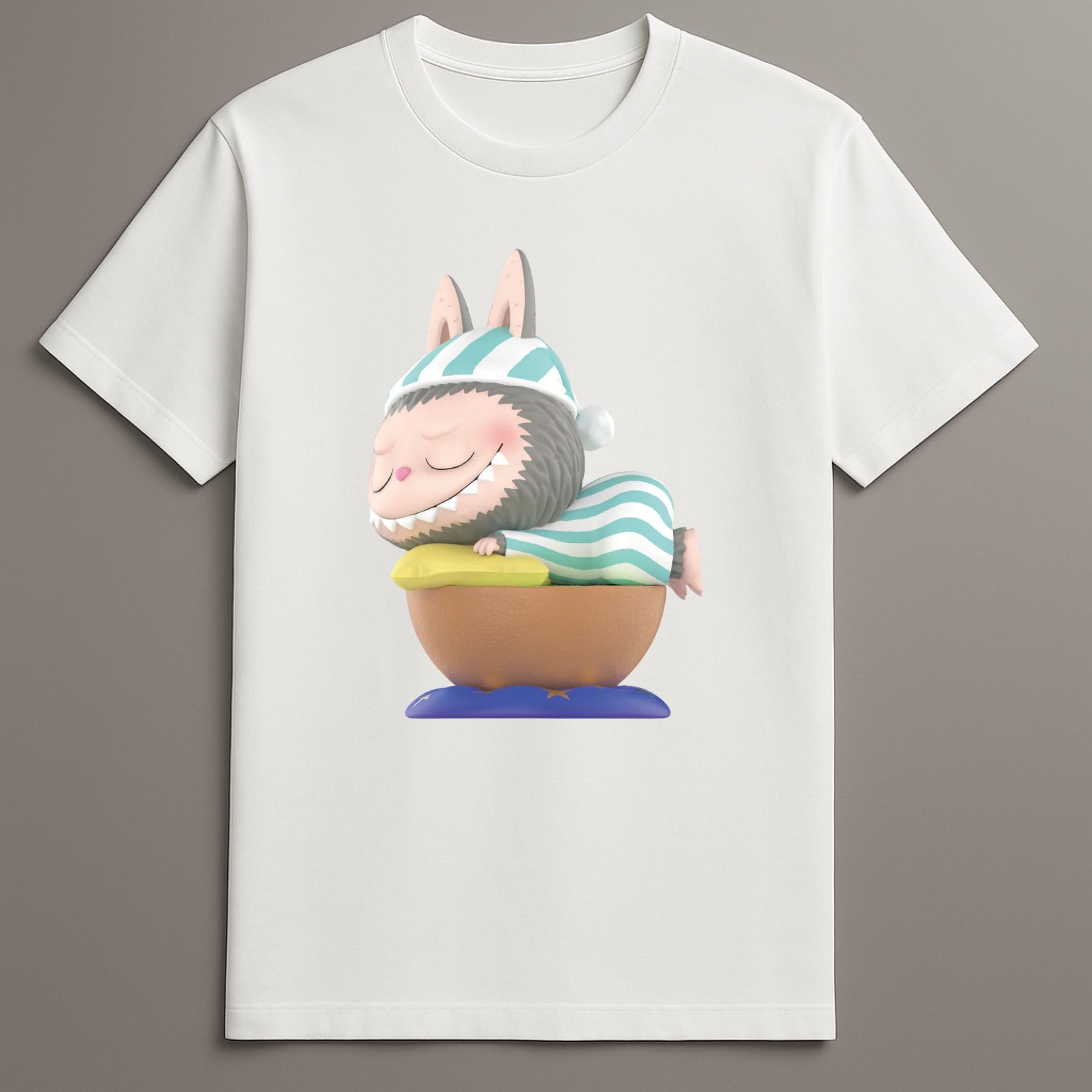 The Labubu Sleepy Fruit Tshirt offers calm style for everyday looks. Featuring a cartoon graphic, this tee blends character art and casual structure. The front showcases Labubu resting in a simple yet charming pose. Made for regular daily use, the Labubu Sleepy Fruit Tshirt is a go-to item for comfort and creative wear. The polyester spandex tee fabric keeps it flexible and smooth. Its design captures character style without loud patterns. Whether worn as a solo piece or part of a layered outfit, this short sleeve shirt delivers comfort and quiet personality.