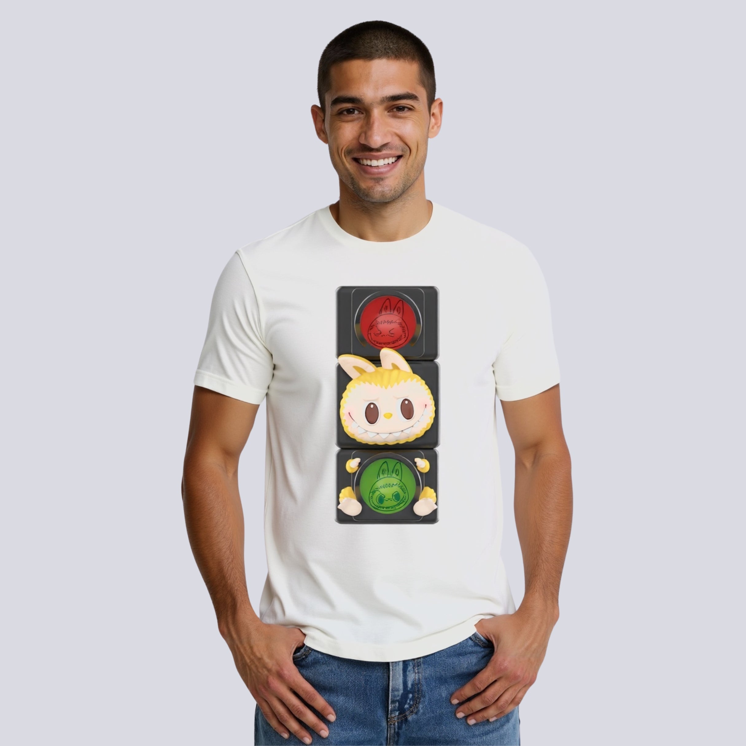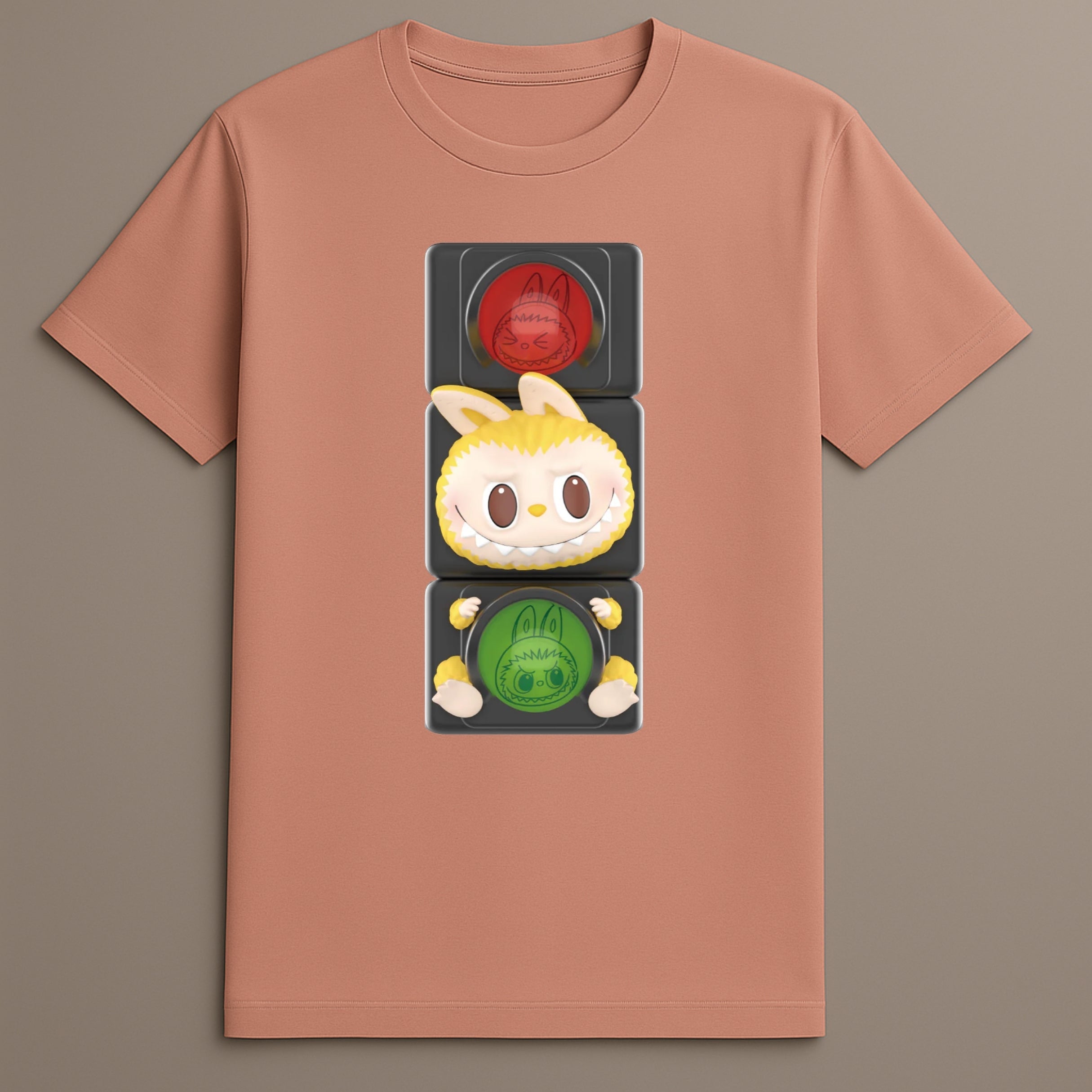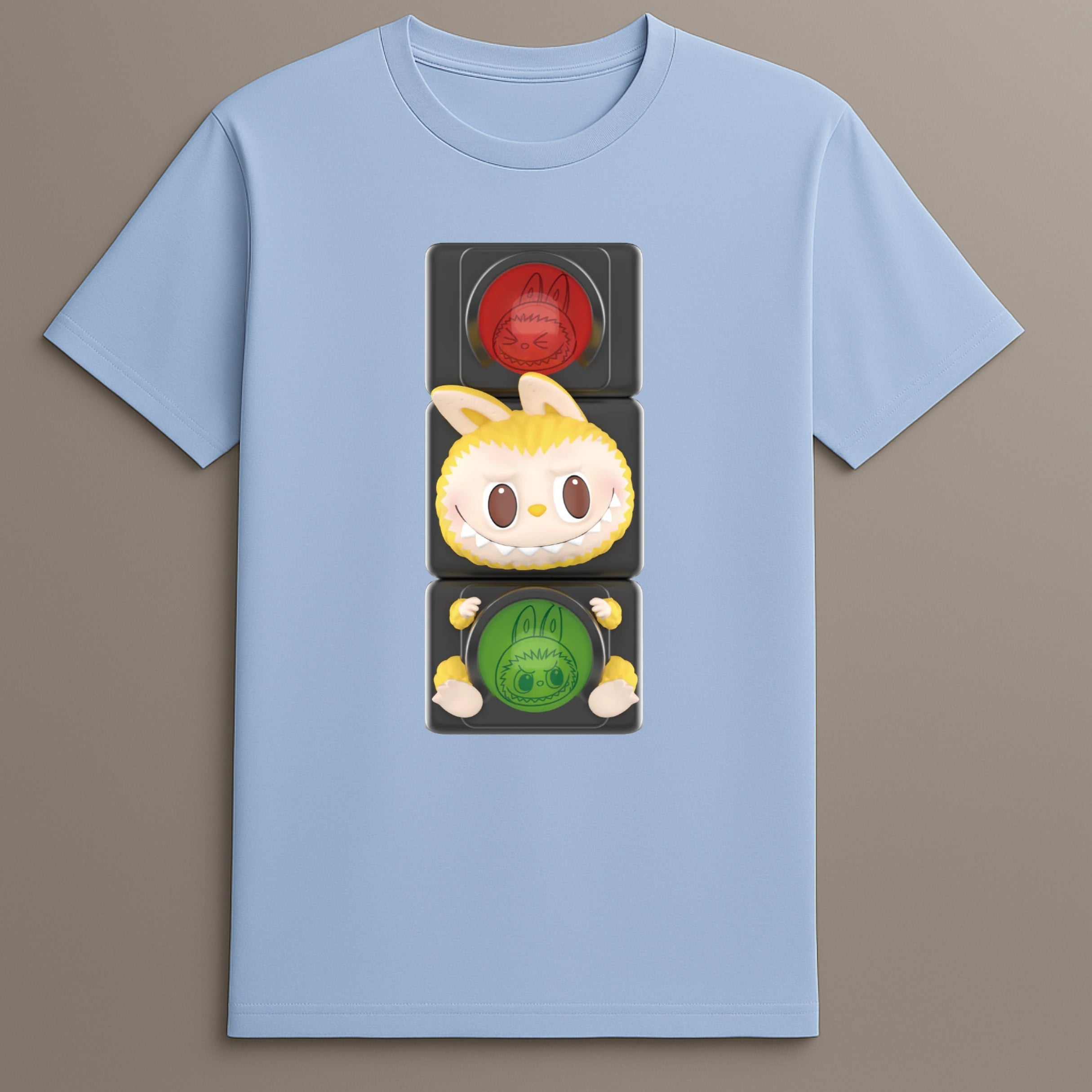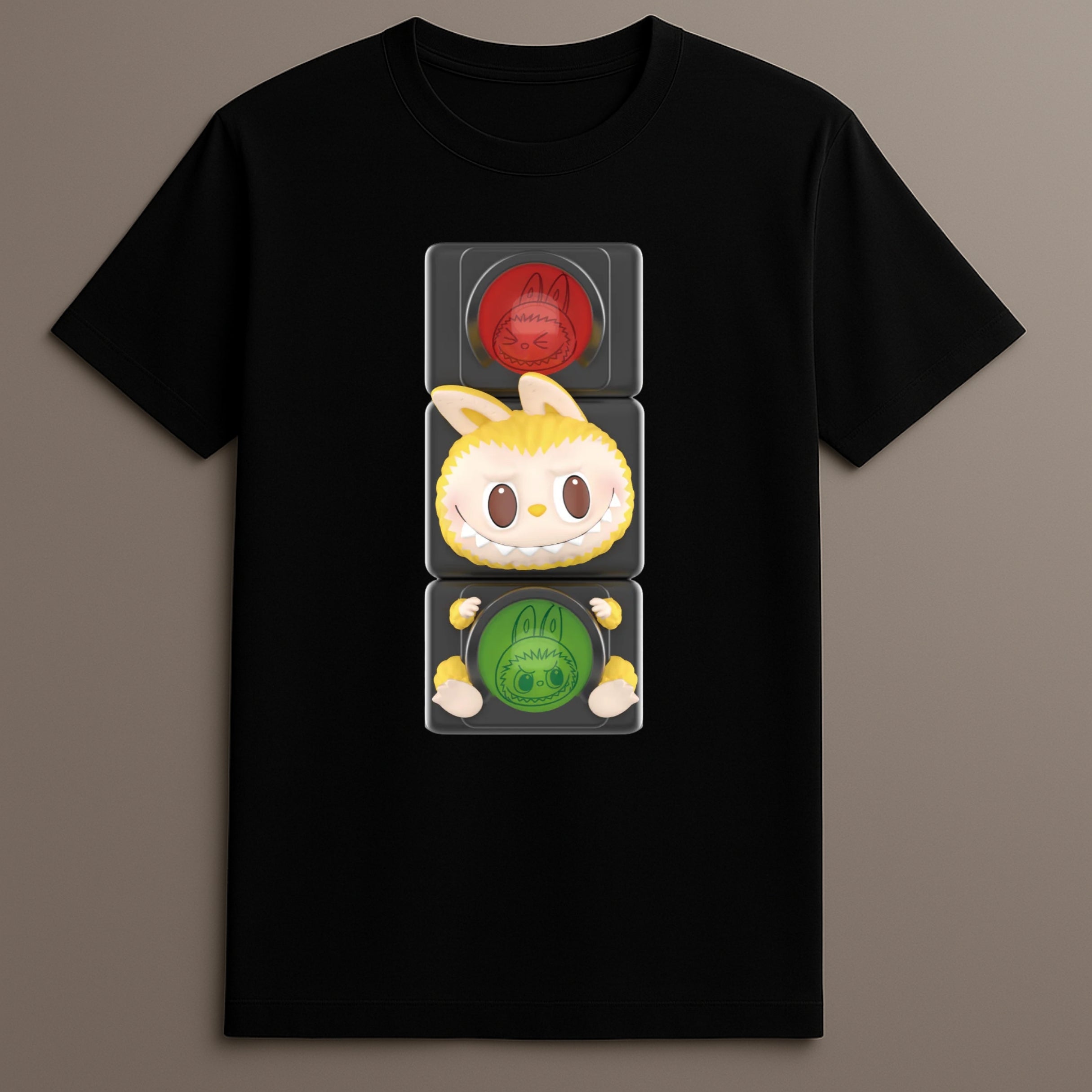 Step into playful expression with the Labubu Traffic Light T-Shirt, where visual storytelling meets wearable design. This unisex graphic tee features Labubu, a character—cleverly placed within a three-tiered traffic light illustration. Set against bold red, yellow, and green color zones, the bunny peeks from the middle signal, combining urban elements with a pastel, character-driven aesthetic. Designed for fans of pop culture, kawaii fashion, and symbolic streetwear, this tee transforms an ordinary signal into an unexpectedly charming style piece.