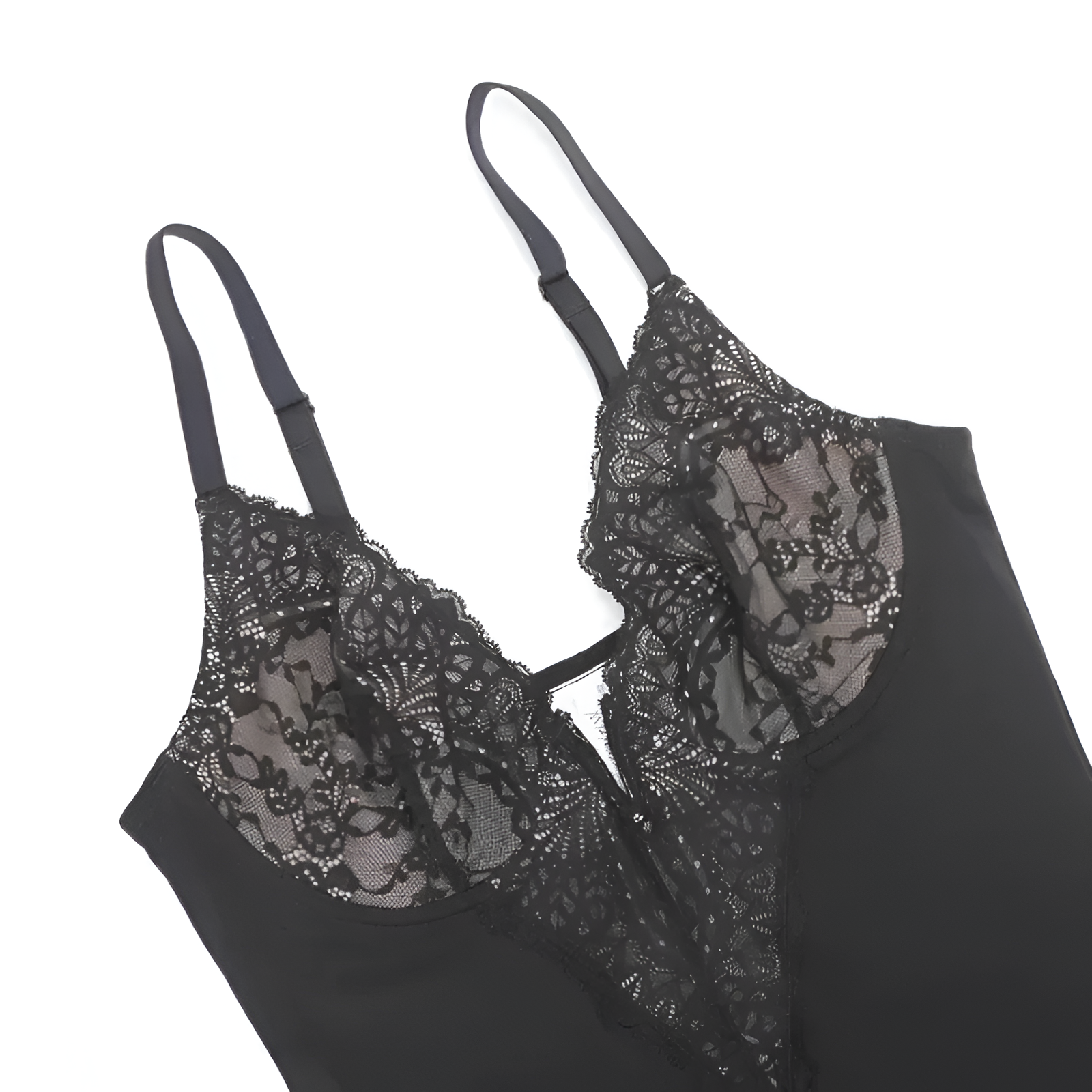 Adjustable straps allow modification for individual preference. The strap structure ensures alignment across the shoulders while supporting the overall silhouette. The support design creates a seamless exterior appearance under the lace panel.