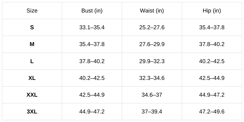 Size Chart (Inches):