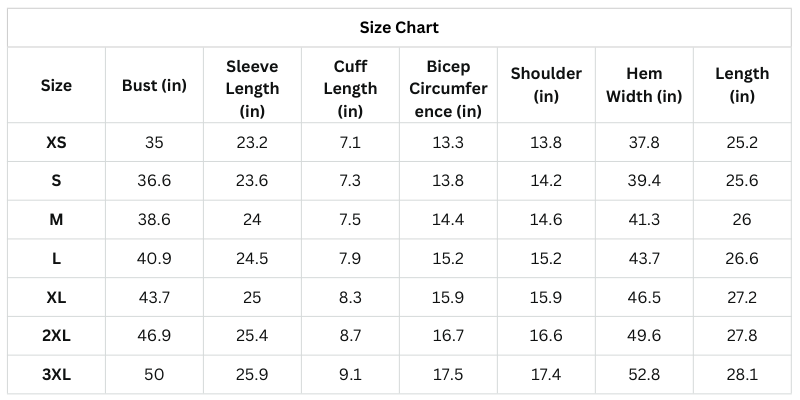 Size Chart (Inches):