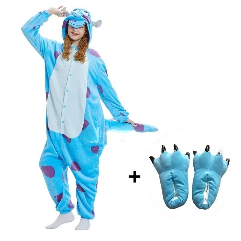 Get ready to snuggle up in our Monster Family Jumpsuits With Matching Plush Slippers, great for both kids and adults. This adorable onesie features a blue monster design complete, spots, and a tail, making it ideal for lounging, themed parties, or cosplay. Made from ultra-soft fleece material, it ensures warmth and comfort, while the loose-fitting style allows for free movement. The onesie includes practical pockets for keeping small essentials and a button-down front for easy wearing. The matching plush monster slippers complete the fun look, making this onesie set for any age group.