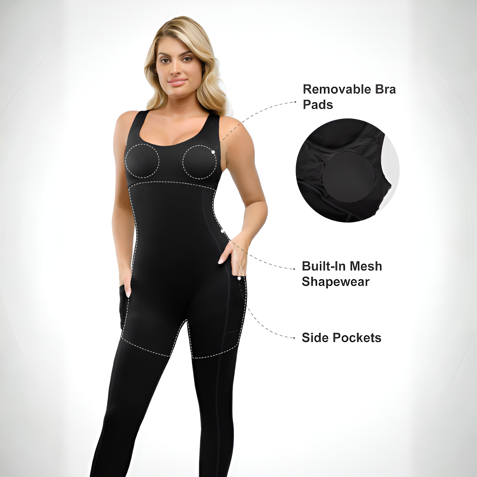 The One Piece Sculpting Jumpsuit combines compression structure, internal mesh support, and practical design features in a single garment. With removable pads, side pockets, and seamless finishing, it supports both active routines and daily wear.