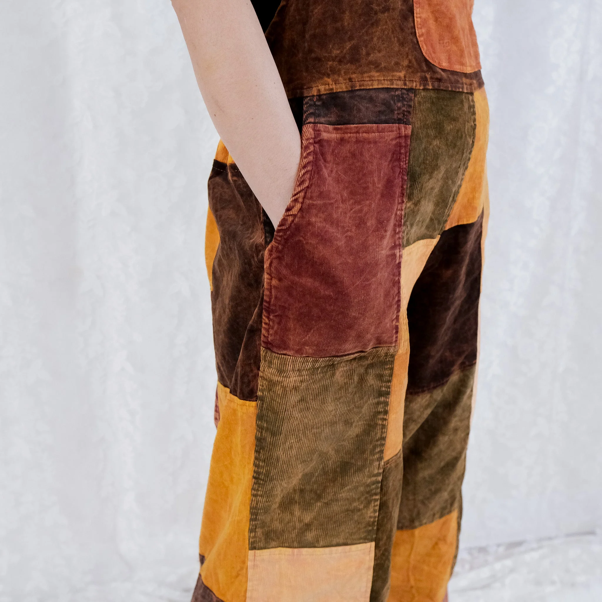 The use of cotton corduroy supports both comfort and durability, allowing long-lasting wear. The practical pockets make the jumpsuit functional for errands, travel, or casual outdoor activities. For anyone seeking slow fashion with a handmade charm, this piece is an excellent choice.