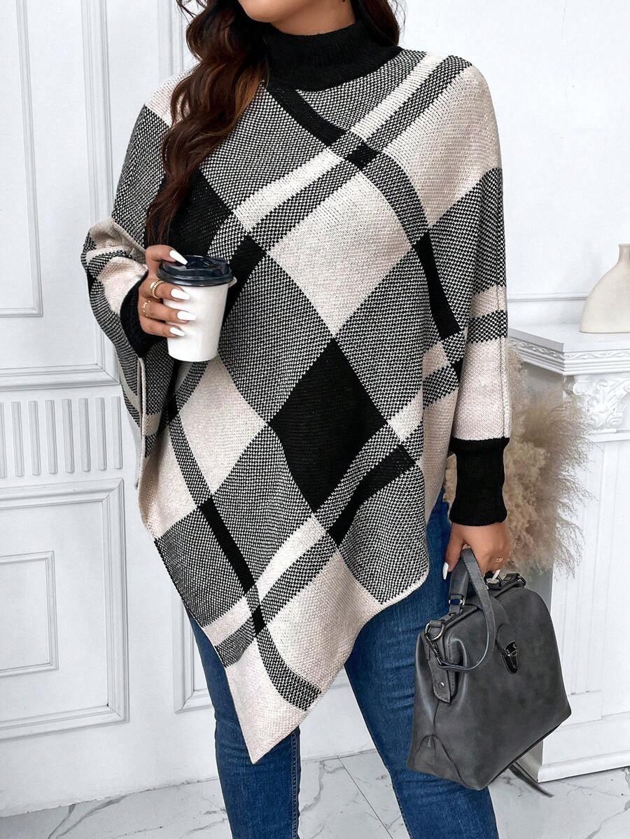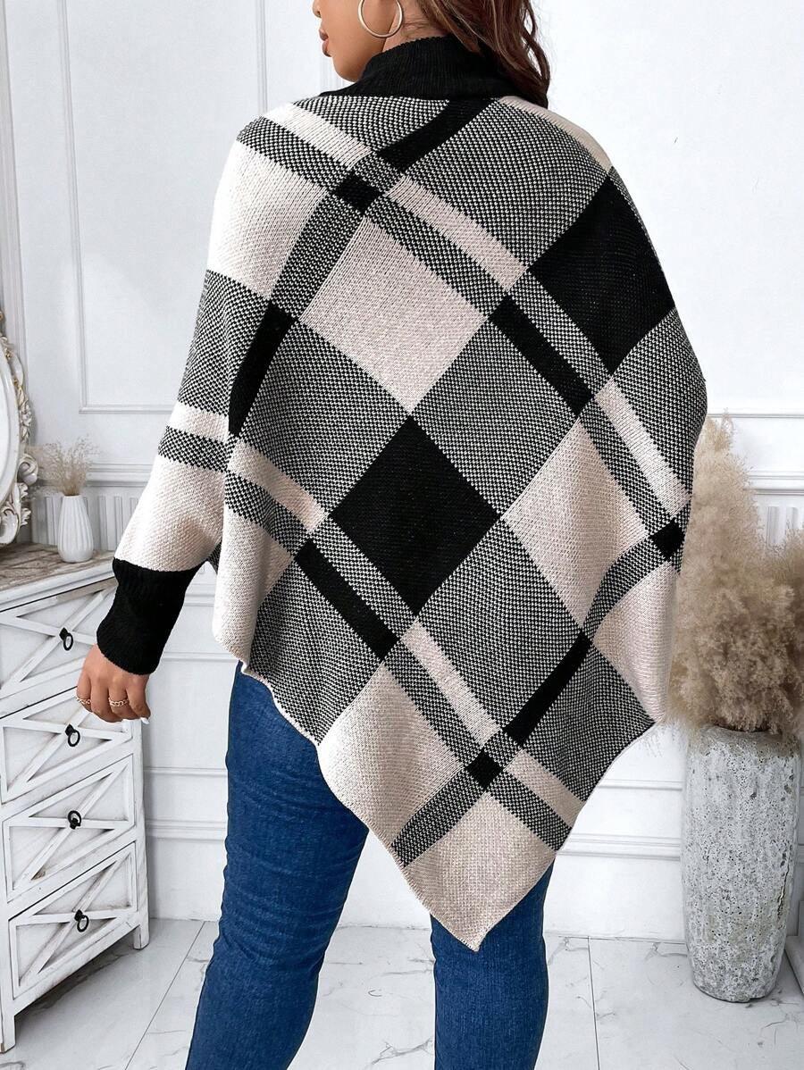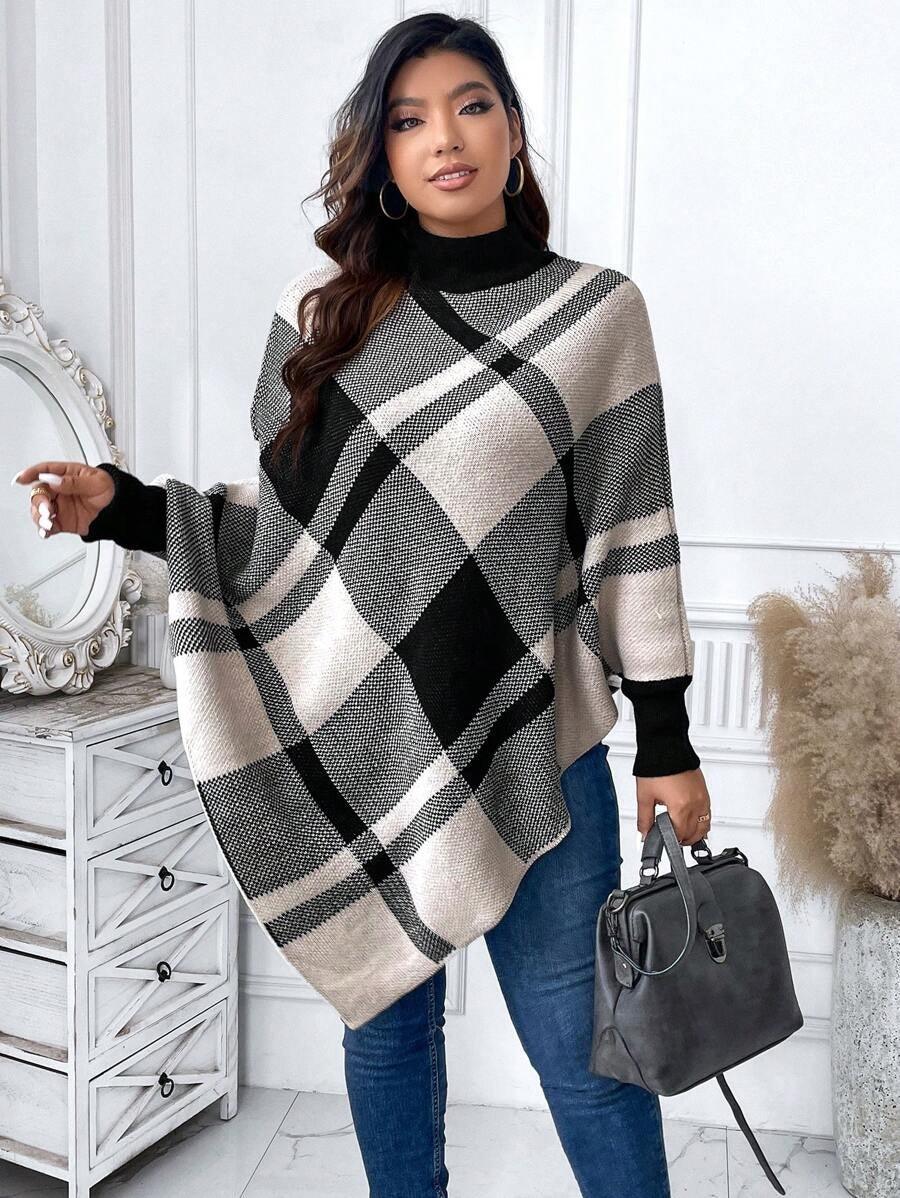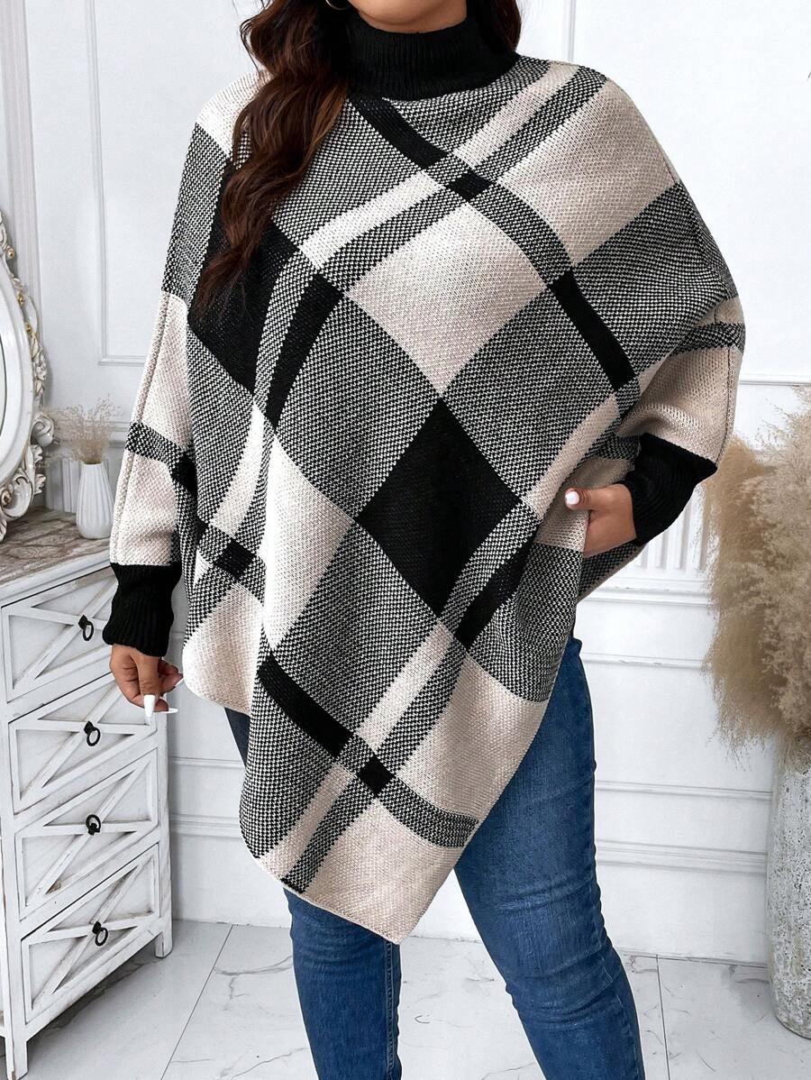 The plaid batwing sleeve poncho blends cozy styling and everyday ease. Its flowy build and soft knit make it a solid pick for changing weather. Designed with an asymmetrical knit poncho shape and stand collar knitwear structure, it suits many layers underneath. The extra long sleeve keeps you covered. This loose cloak poncho fits well in any casual setting. Whether you style it for a walk or layer it for a cool office morning, the poncho pullover gives you function and form. The plaid batwing sleeve poncho is a great blend of structure and comfort.