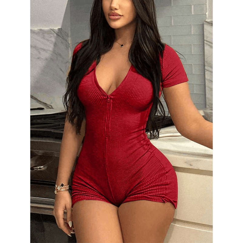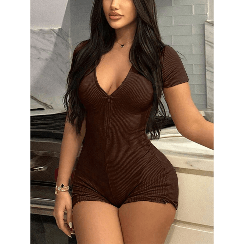 The standout feature of the Plain Zipper Front Jumpsuit is its adjustable neckline, thanks to the front zipper. This design allows you to customize your coverage, making it perfect for layering or wearing on its own. The ribbed fabric adds texture and stretch, creating a contoured fit that moves with your body. The short sleeves make it an excellent choice for warmer weather, while the form-fitting silhouette ensures a and modern look.