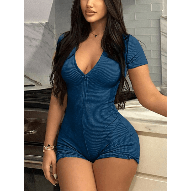 The Plain Zipper Jumpsuit is designed to be your go-to piece for both comfort and style. Its adjustable neckline gives you versatility, while the ribbed fabric ensures a perfect fit. The body-hugging silhouette flatters your shape, and the short sleeves provide the ideal coverage for warmer weather. Whether you're dressing for a casual outing or lounging at home, this jumpsuit offers the comfort and flexibility you need.
