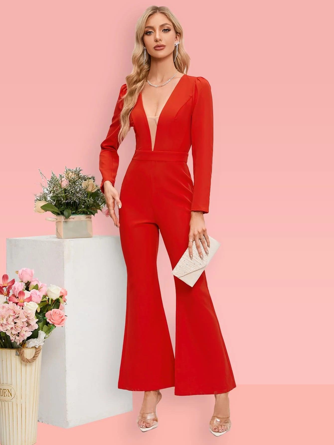 Plunging Neck Flare Leg Jumpsuit featuring a deep V-neckline, sheer contrast mesh, and puff sleeves, this jumpsuit is perfect for any occasion. The high waist and flare leg design elongate your legs for a flattering silhouette. Made from a slightly stretch polyester fabric, it hugs your curves in all the right places. With a long length and zipper closure, it's easy to wear.