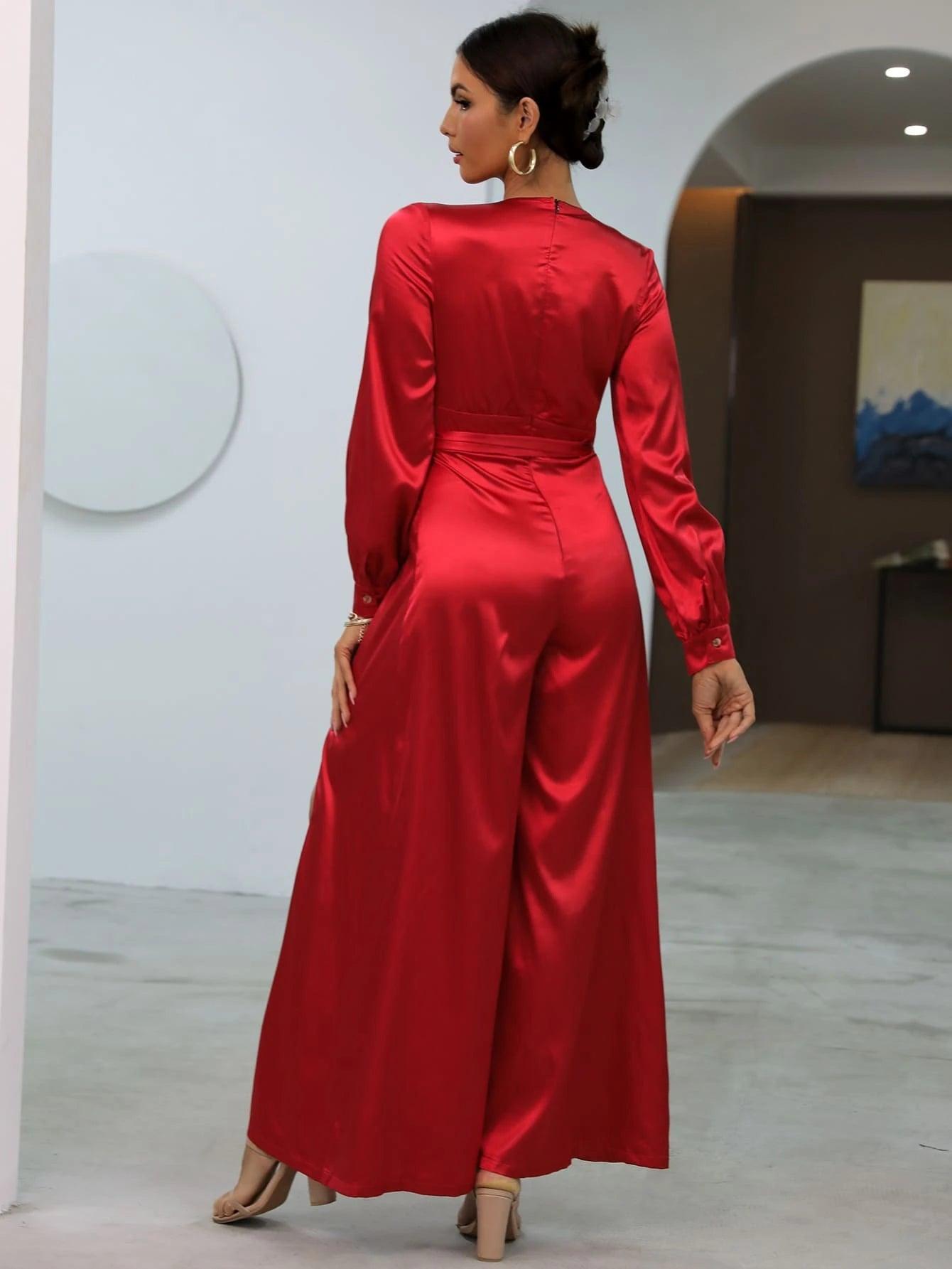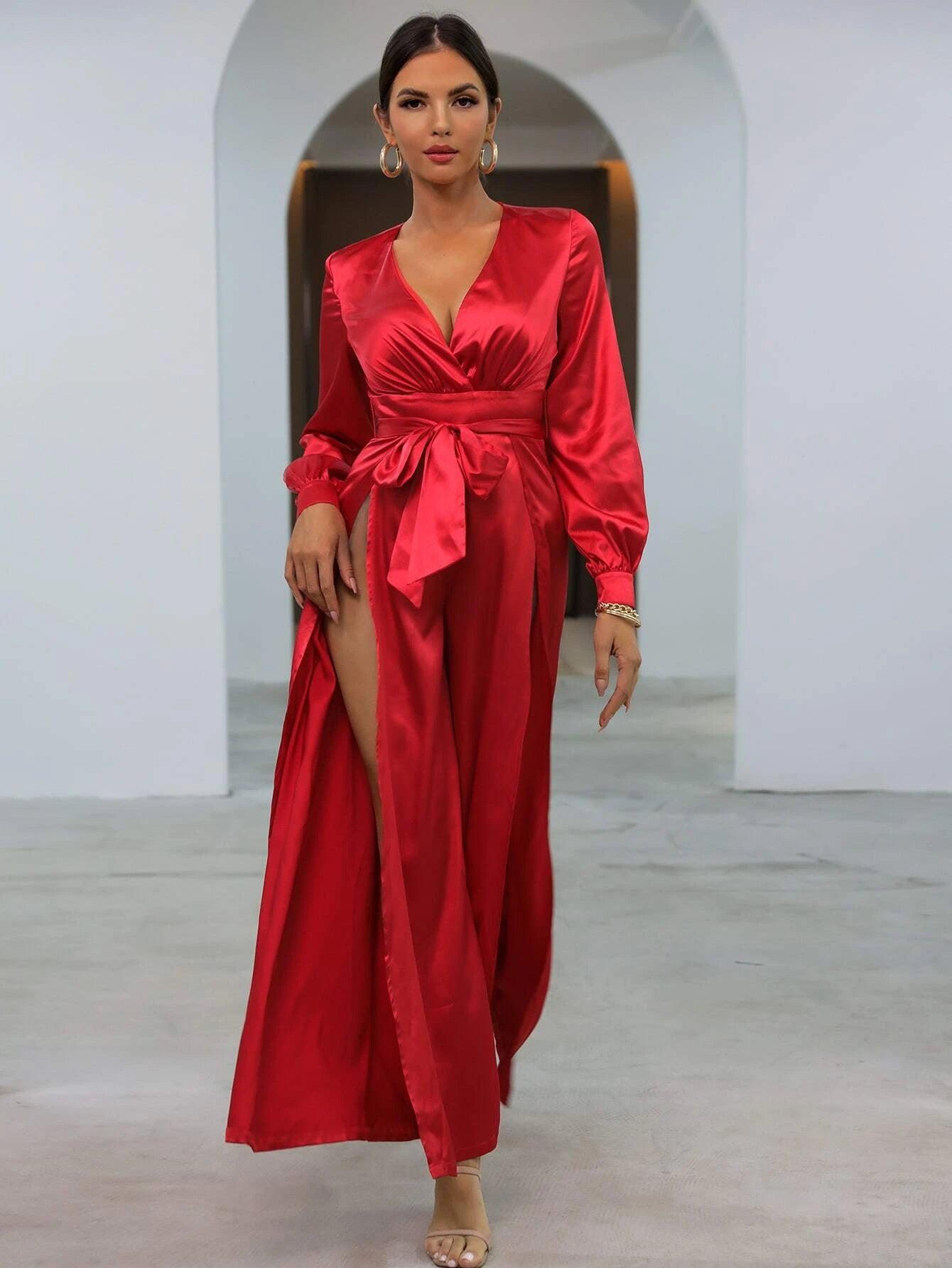 Capture timeless elegance with this Plunging Neck Split Thigh Belted Satin Romper. Crafted with a deep V neckline, a luxe polyester and elastane blend fabric, and a waist-defining wrap belt, this exquisite romper will ensure you look and feel like a modern-day goddess. The billowing bishop sleeves add a hint of refinement to this piece, making it an undeniably sophisticated addition to your wardrobe.