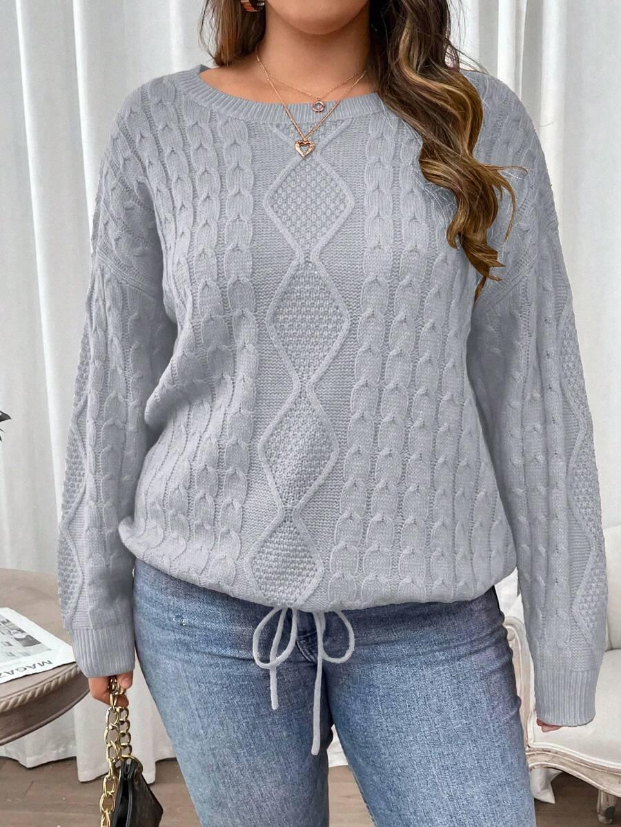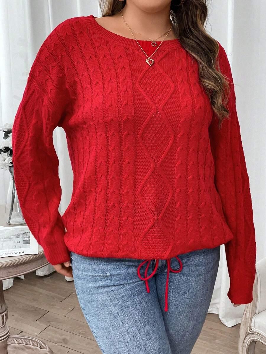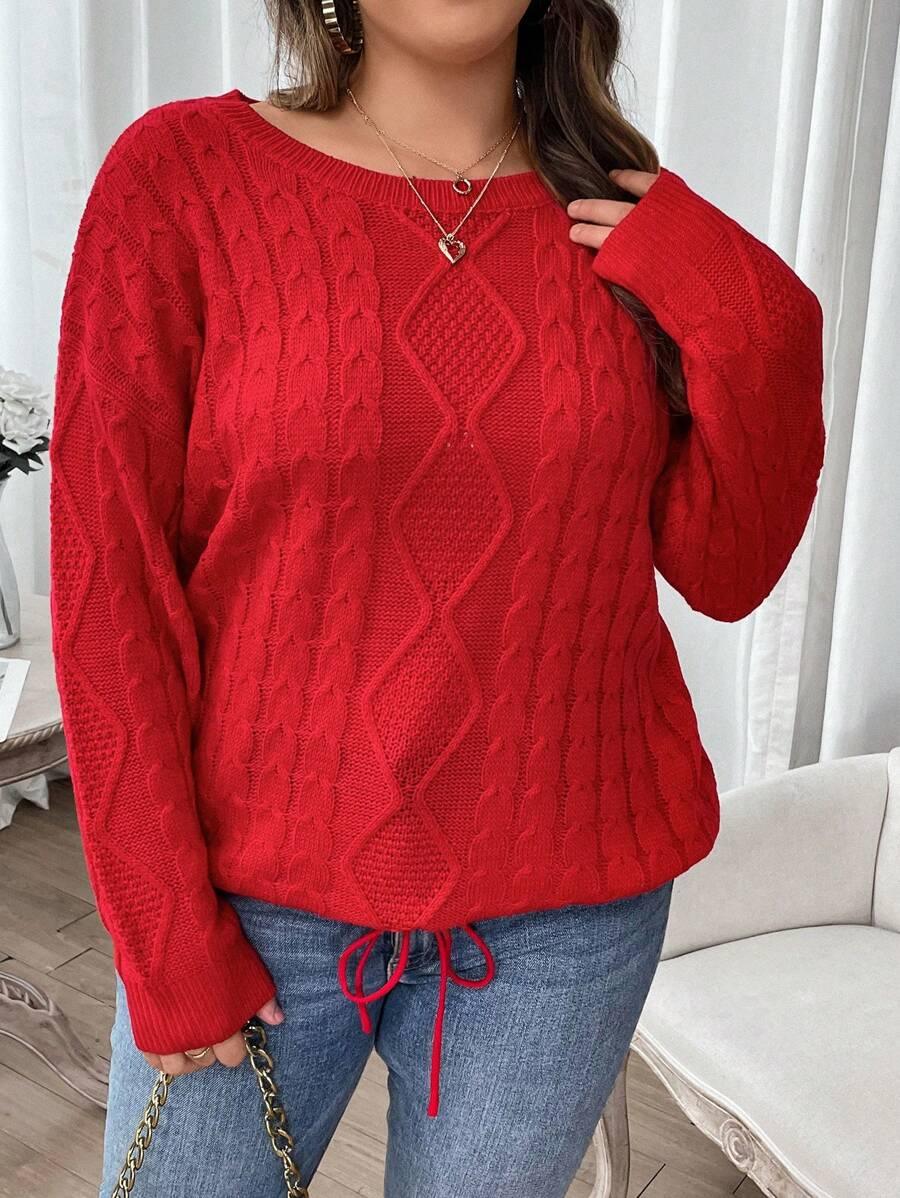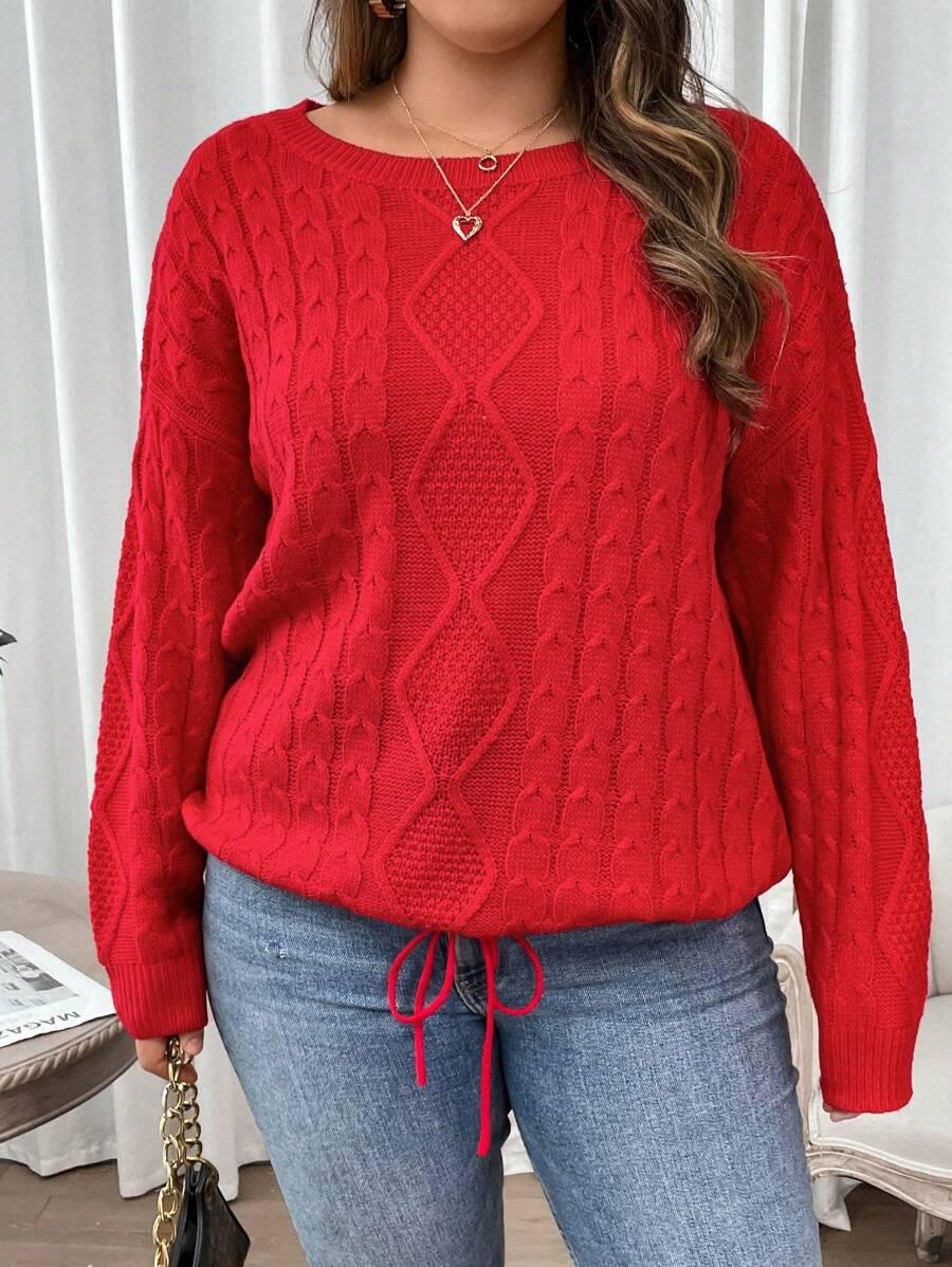 Celebrate the holiday season in style with our Plus Christmas Cable Knit Drawstring Hem Sweater. This sweater, featuring a classic cable knit design, exudes festive charm. The drawstring hem allows you to adjust for a personalized fit, making it a cozy and versatile addition to your winter wardrobe. This beautifully designed sweater with its festive cable knit pattern is perfect for holiday parties or casual outings.