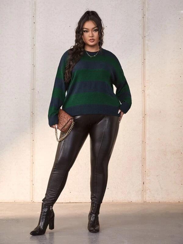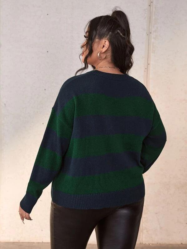 The Plus Colorblock Drop Sweater offers a clean, balanced look for cooler weather. Its wide horizontal stripes give it a casual touch while the construction remains refined enough for daily wear. With a colorblock design and drop shoulder style, this pullover adds dimension without bulk. Designed for ease and movement, it works well across settings from weekends to errands in town.