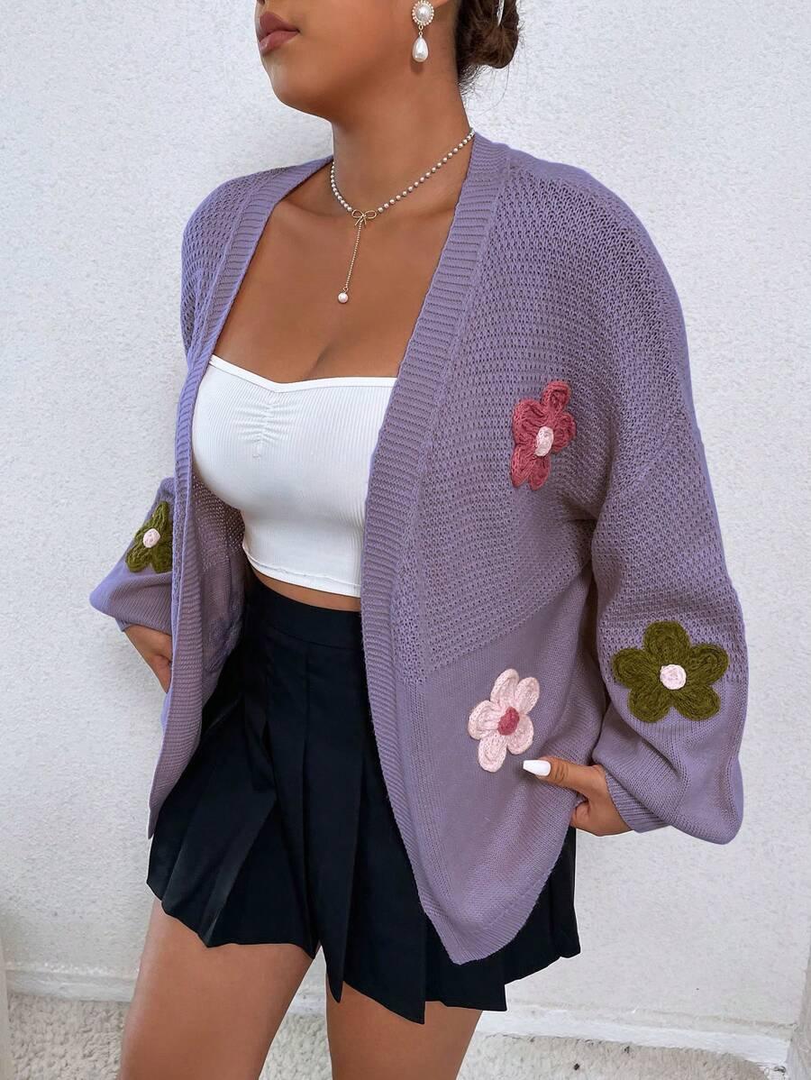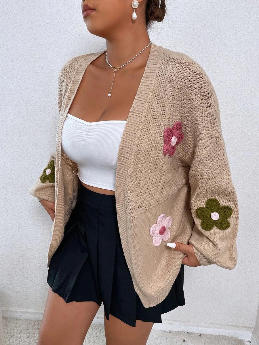 Accented with detailed floral appliques in various hues, each motif is securely stitched into the cardigan for lasting design impact.