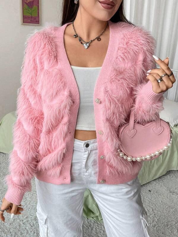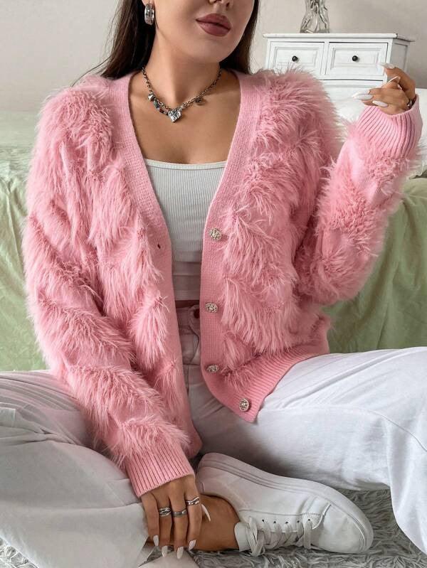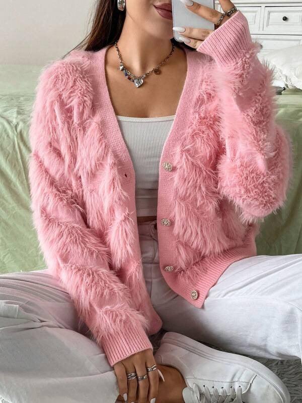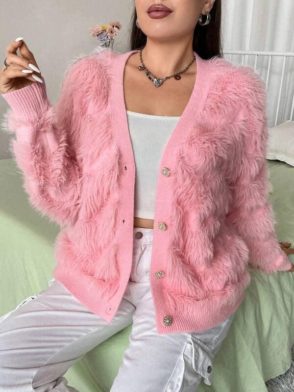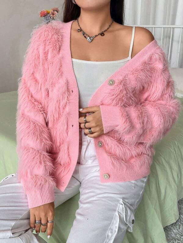 The standout feature of this cardigan is its plush knit texture. Crafted with soft, fuzzy threads, the cardigan feels like a gentle hug—warm enough for cool days but enough for layering.