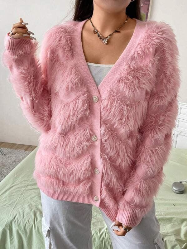Designed with a button-front closure, V nckline, and a drop shoulder silhouette, this cardigan offers laid-back elegance. The plain pink color adds a fresh pop to your outfit, working equally well with muted neutrals or bold seasonal prints.