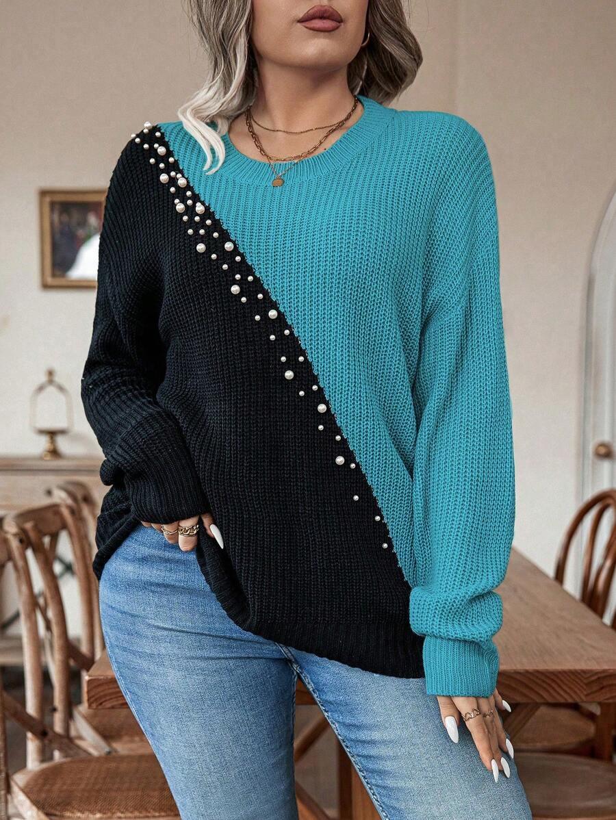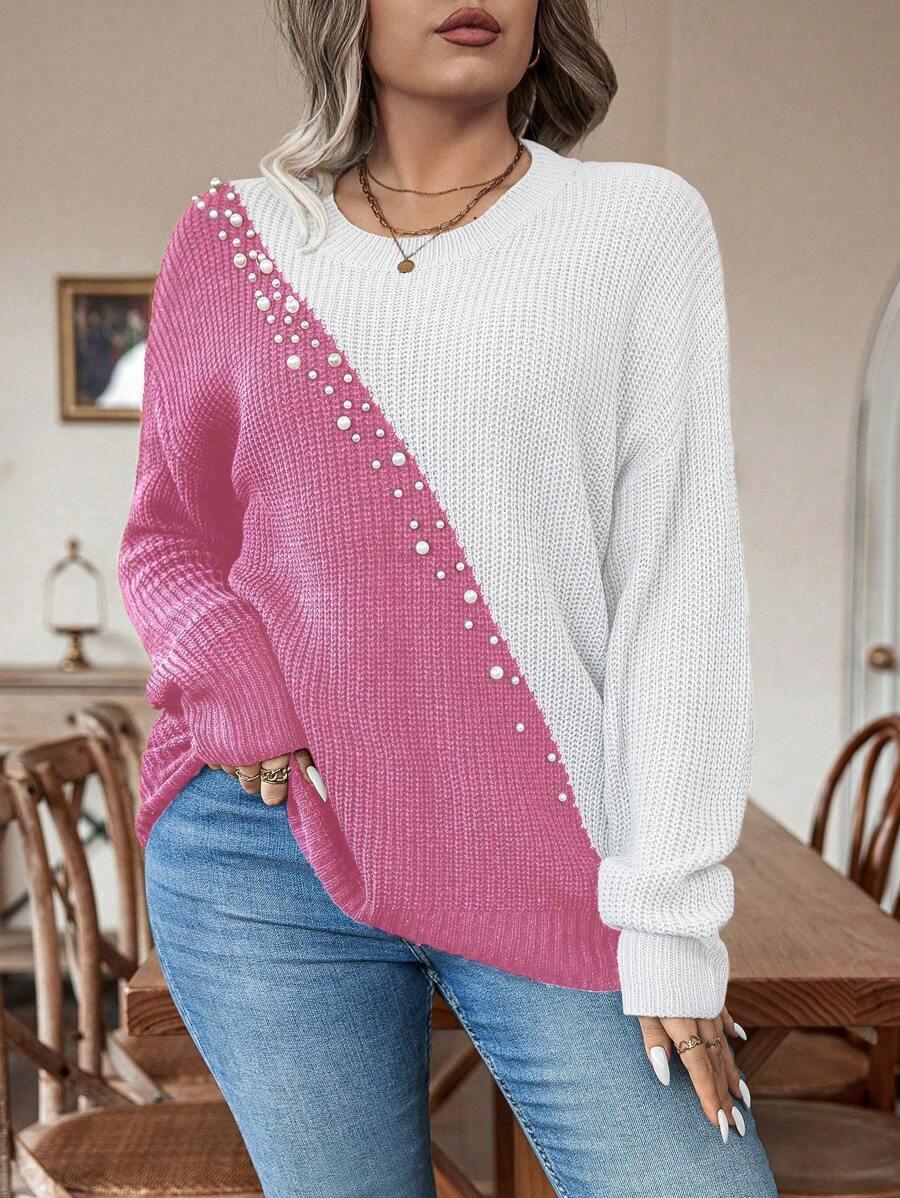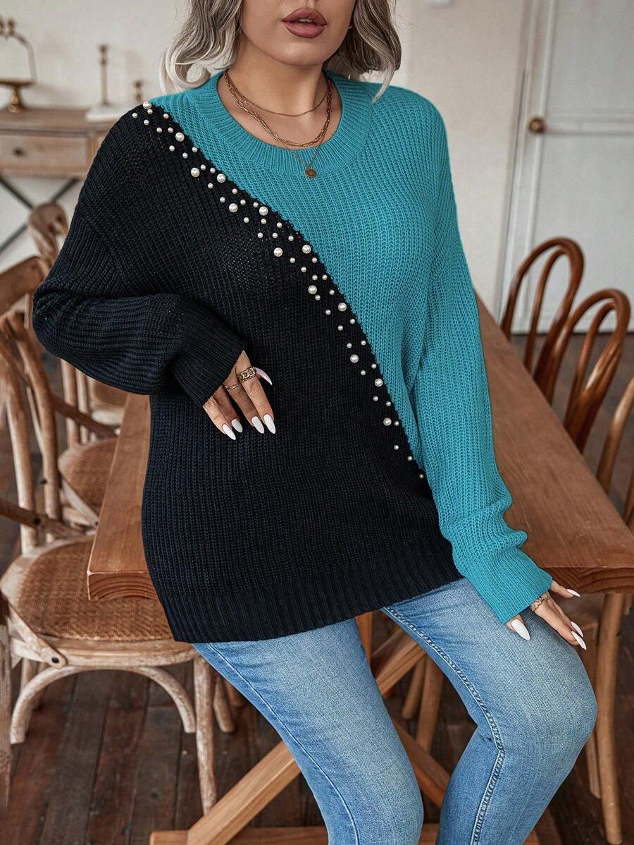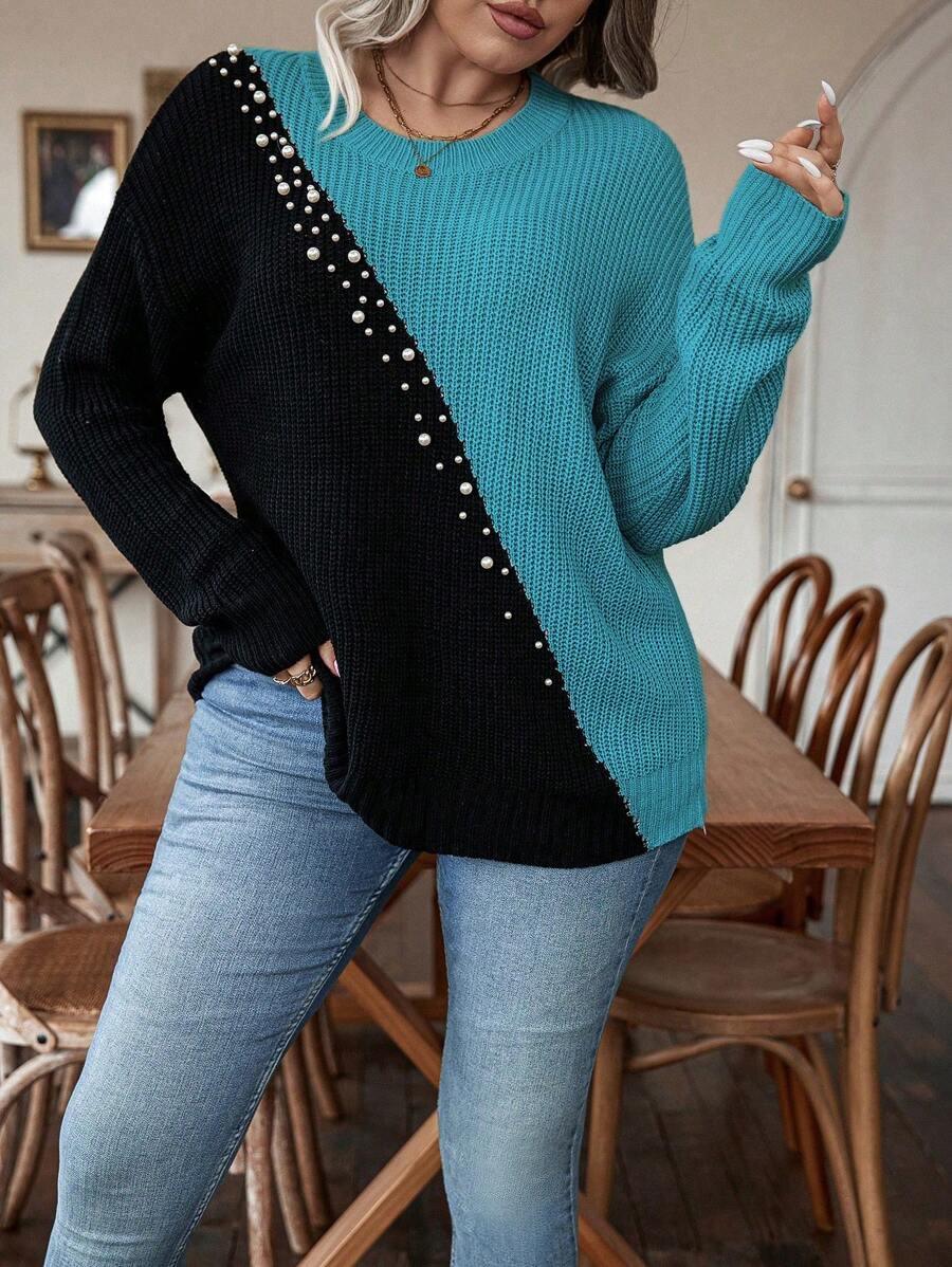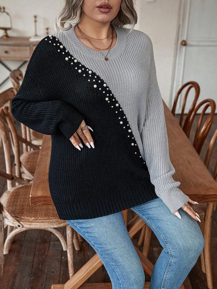 Make a statement with the Plus Size Colorblock Sweater With Pearl Detail, a standout knitwear piece that blends bold design with everyday comfort. Featuring soft, contrasting panels and subtle pearl embellishments, this pullover redefines casual style with a touch of refinement.