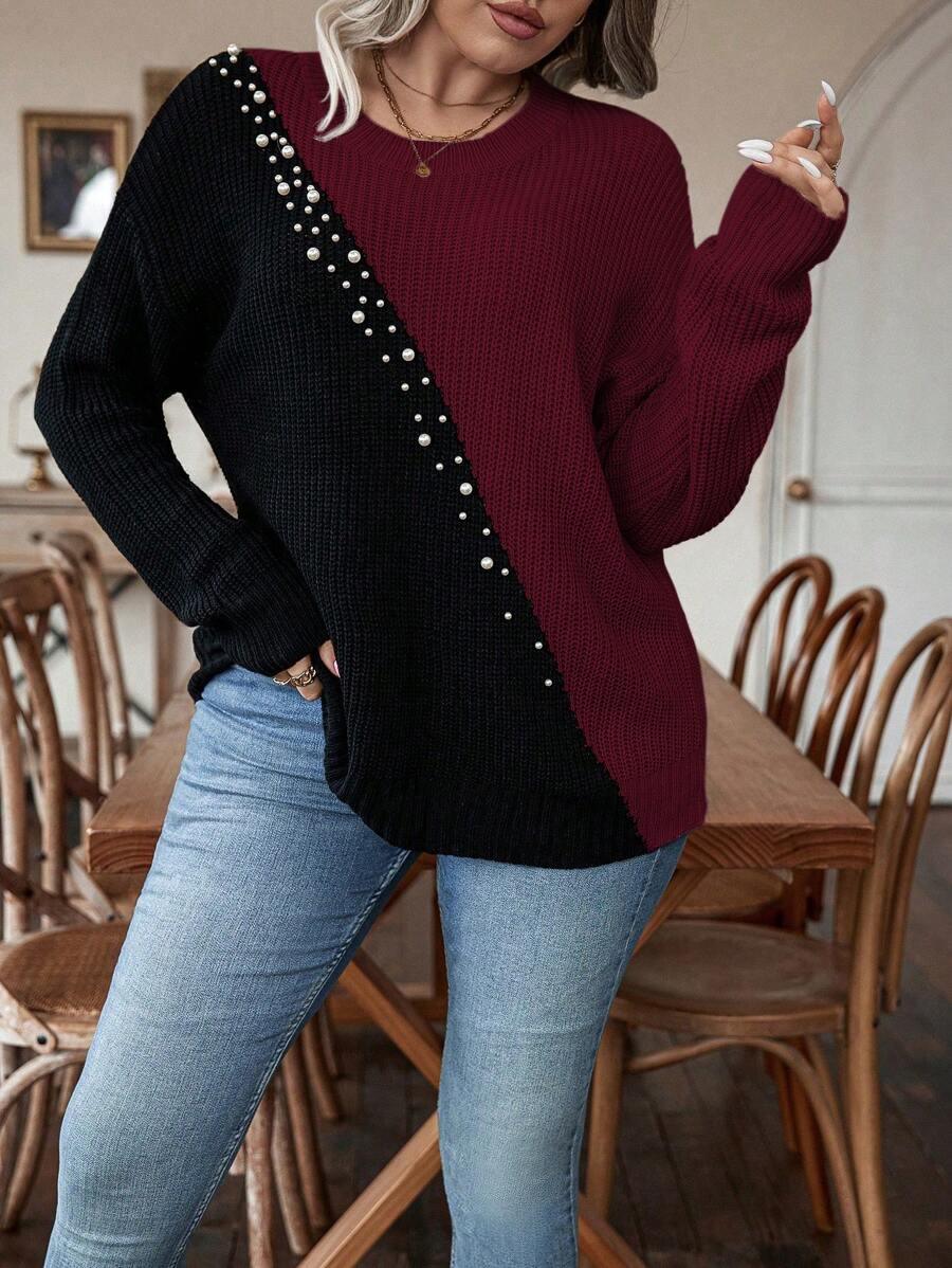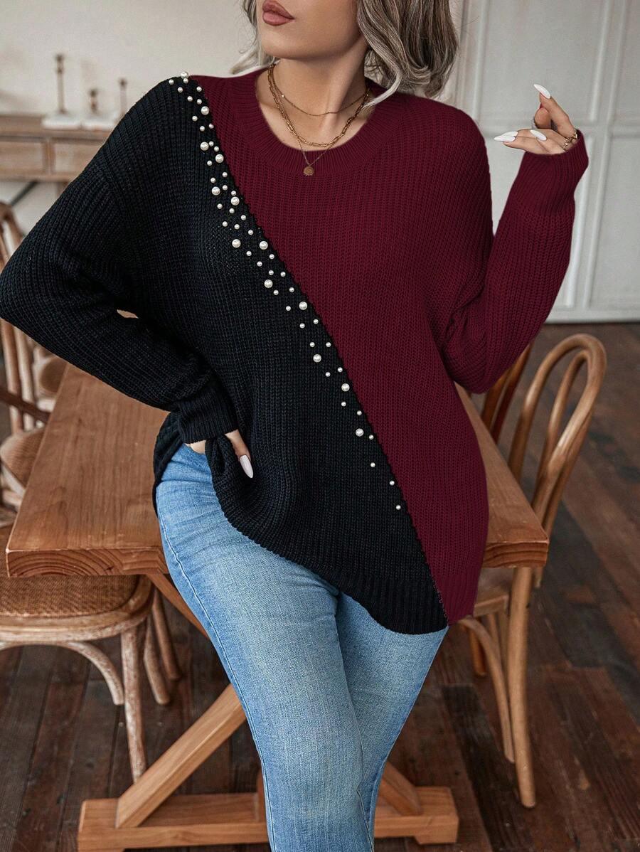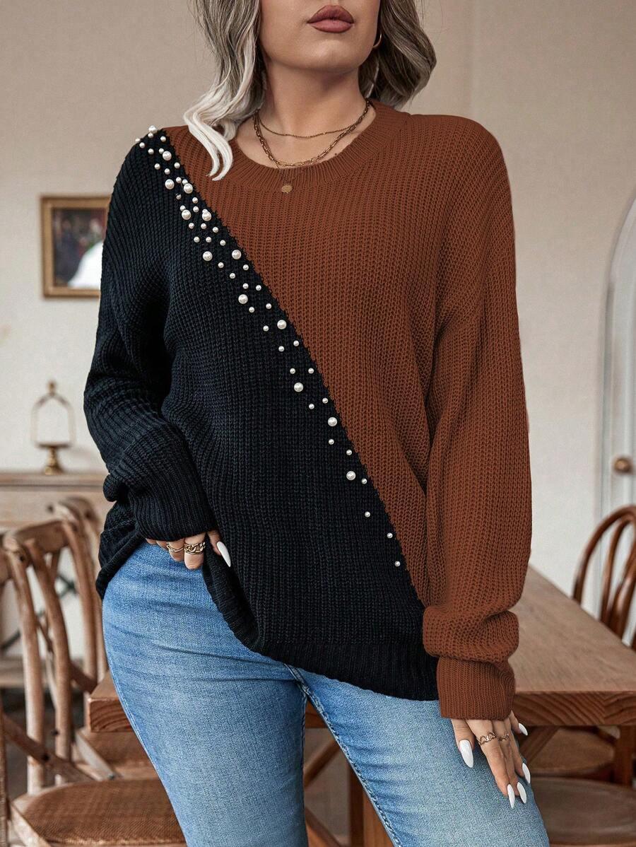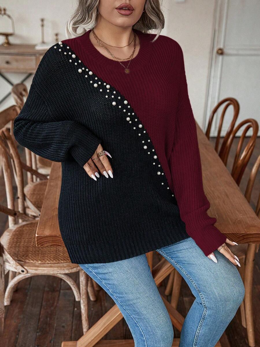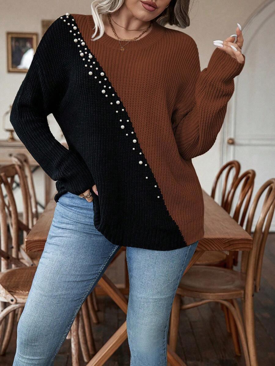 Make a statement with the Plus Size Colorblock Sweater With Pearl Detail, a standout knitwear piece that blends bold design with everyday comfort. Featuring soft, contrasting panels and subtle pearl embellishments, this pullover redefines casual style with a touch of refinement.