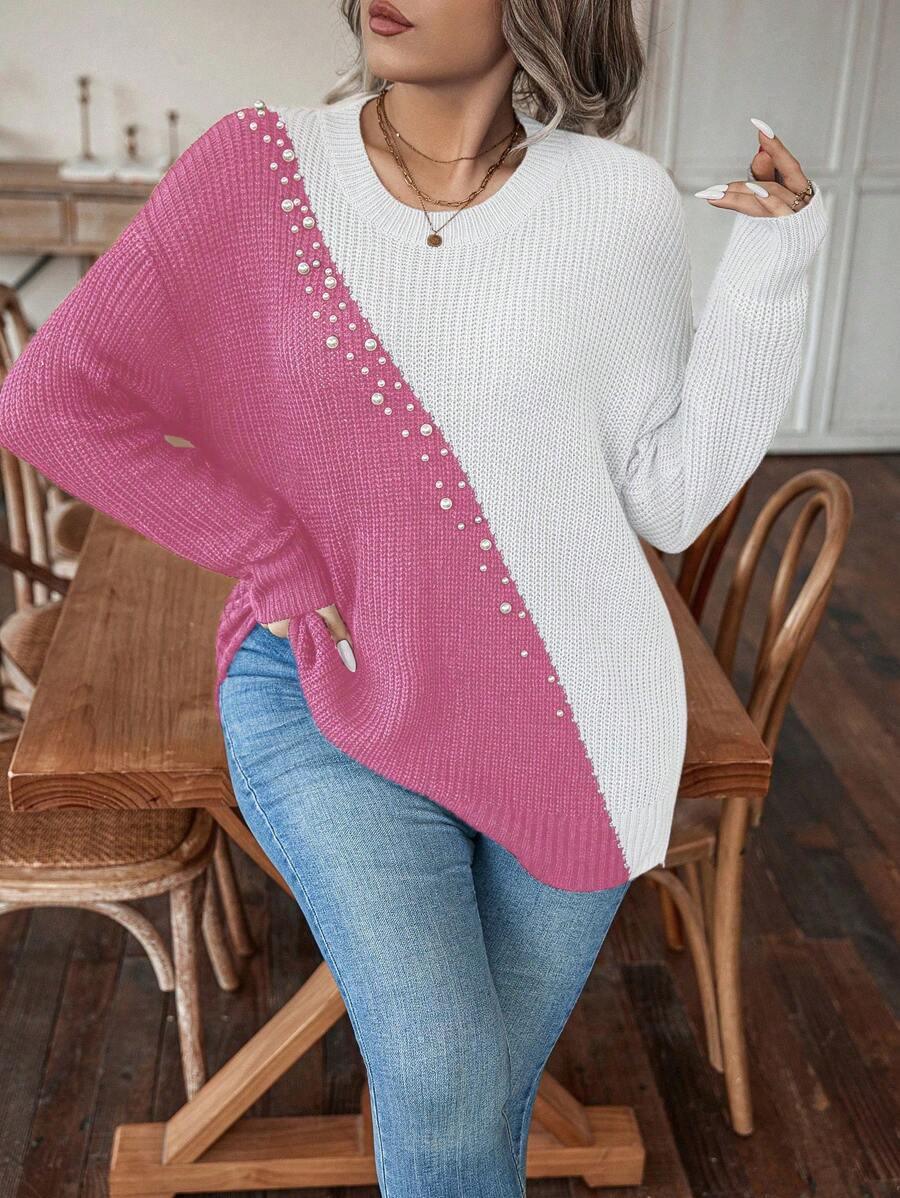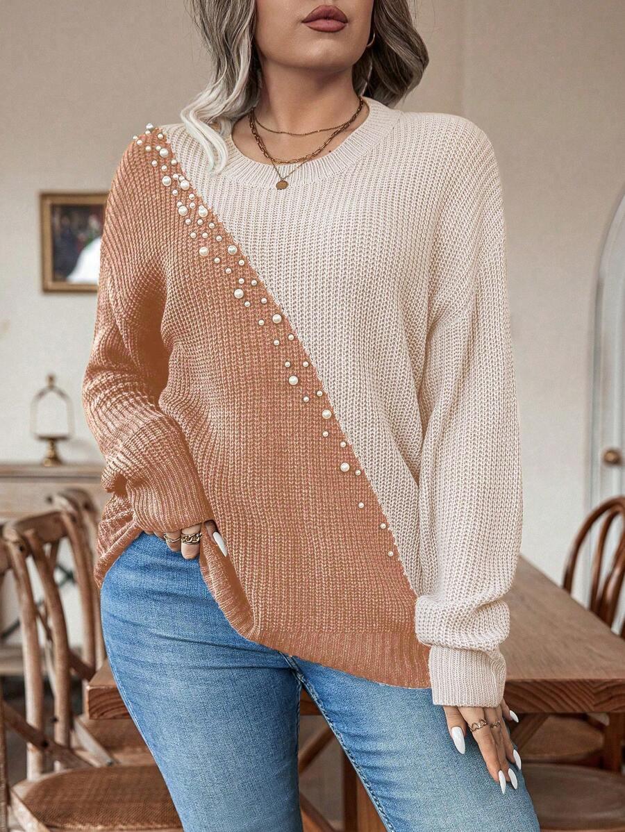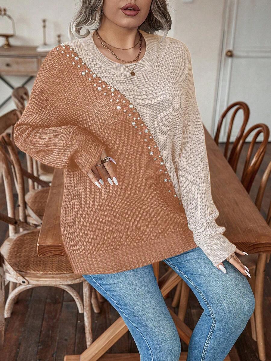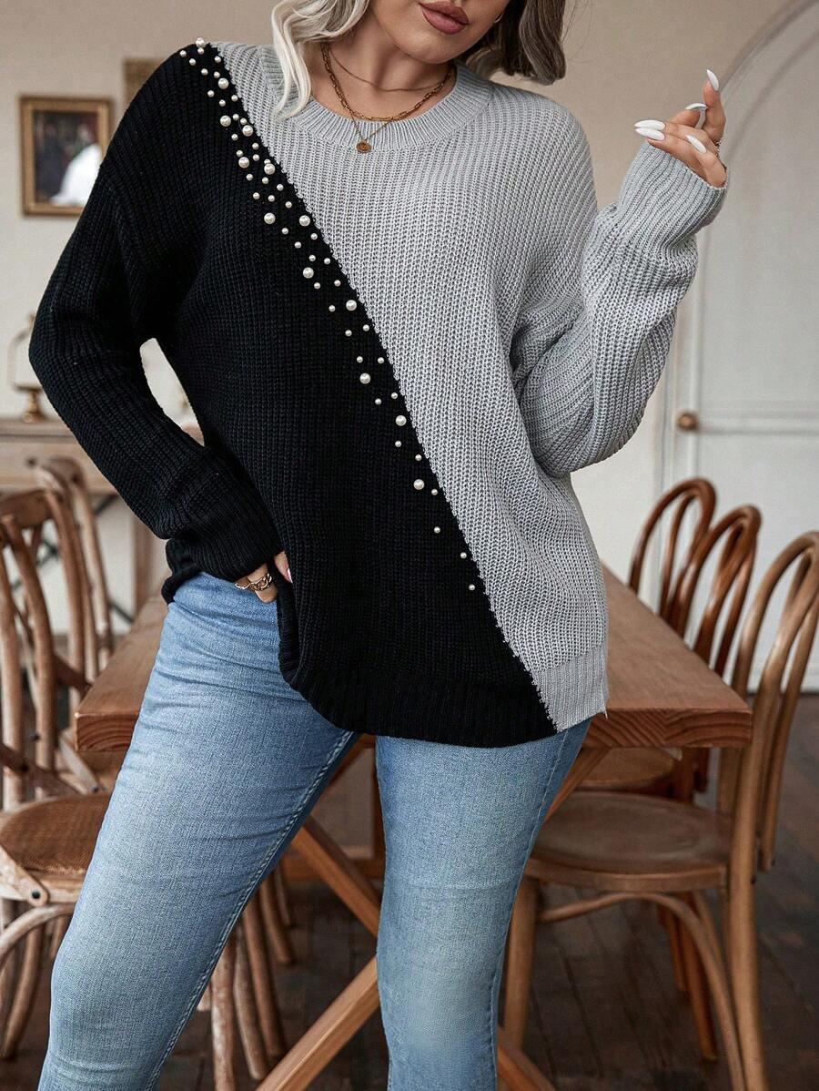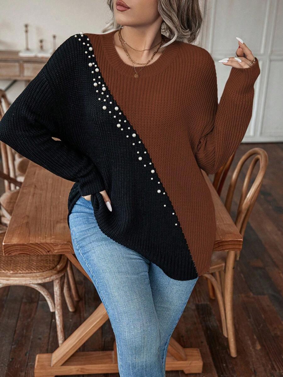 Make a statement with the Plus Size Colorblock Sweater With Pearl Detail, a standout knitwear piece that blends bold design with everyday comfort. Featuring soft, contrasting panels and subtle pearl embellishments, this pullover redefines casual style with a touch of refinement.