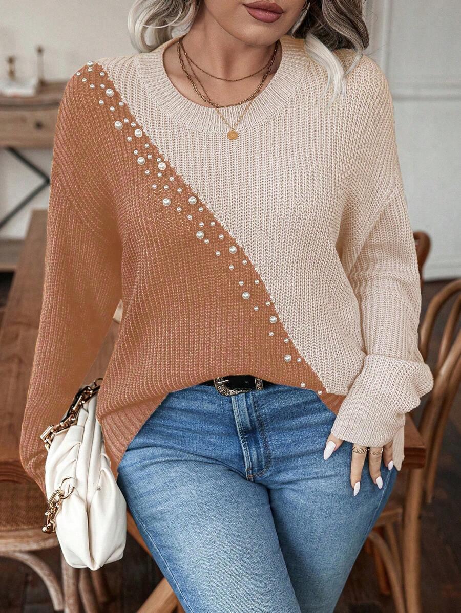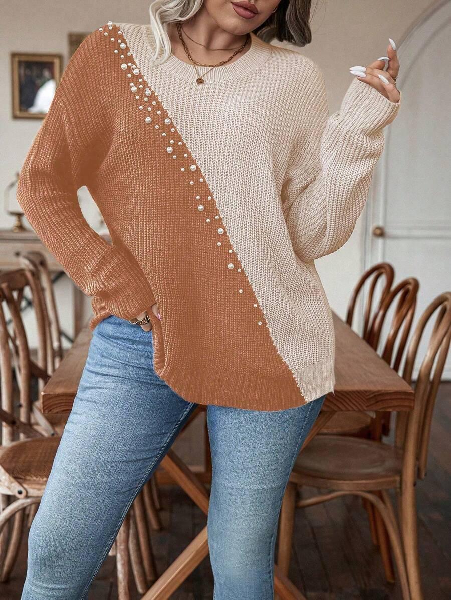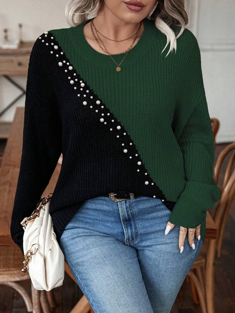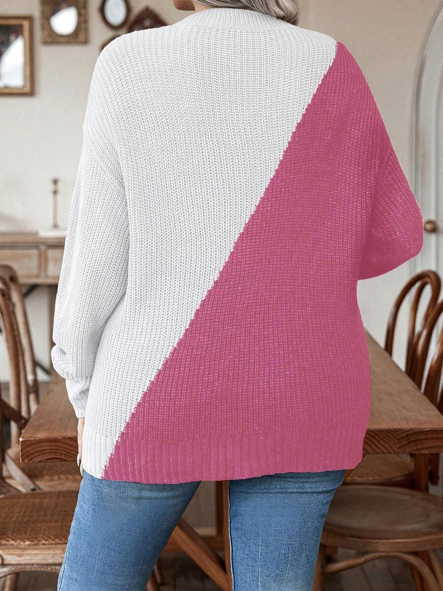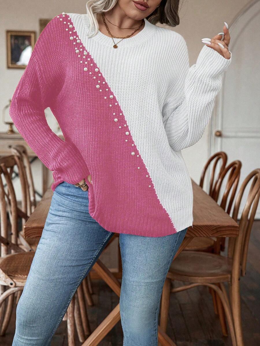 Make a statement with the Plus Size Colorblock Sweater With Pearl Detail, a standout knitwear piece that blends bold design with everyday comfort. Featuring soft, contrasting panels and subtle pearl embellishments, this pullover redefines casual style with a touch of refinement.