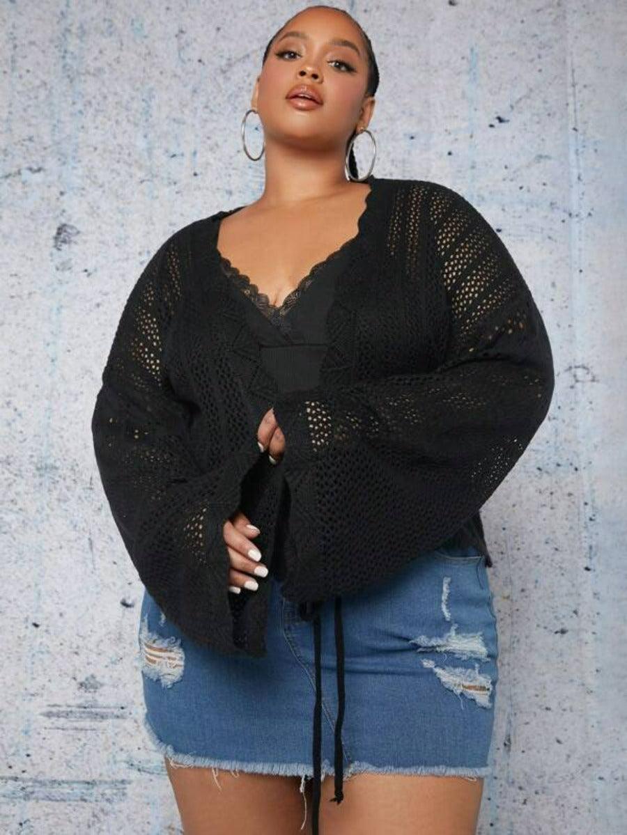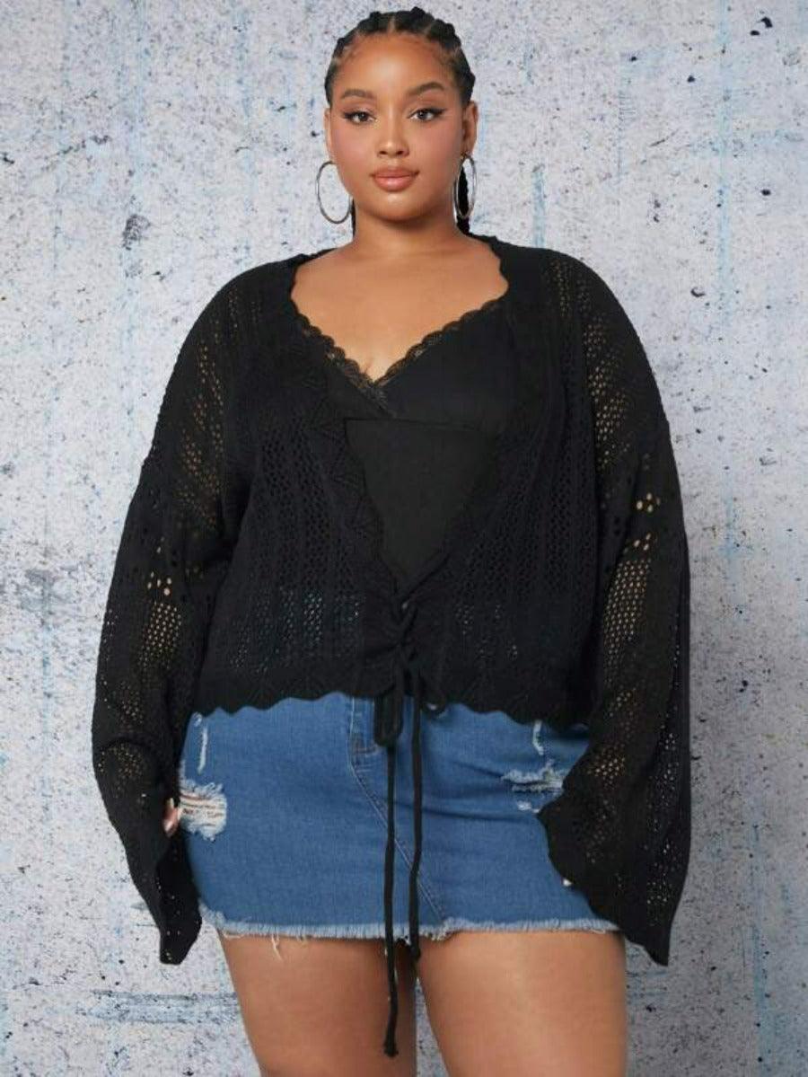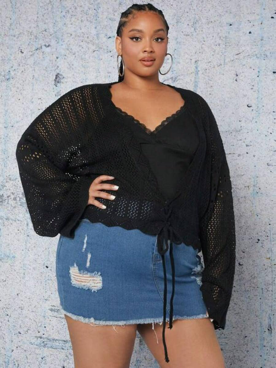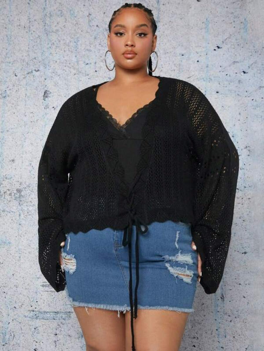 Make casual layering feel effortless with the Plus Tie Front Cardigan. Designed with thoughtful details and a short, structured fit, this cardigan delivers versatile styling without compromise. The deep V neckline, open knit texture, and lace-up front create a laid-back aesthetic with added visual interest. Whether worn over fitted basics or flowy silhouettes, this piece works across your casual wardrobe.