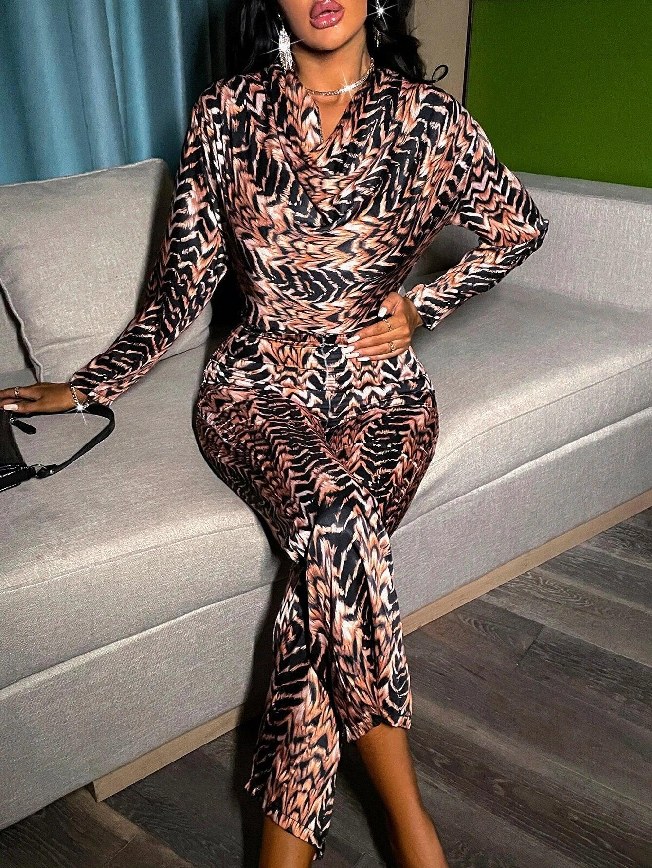 Introducing our Printed Draped Collar Satin Flare Leg Jumpsuit, a perfect addition to your elegant wardrobe. The stunning cowl neckline drapes beautifully over the shoulders, while the luxurious satin fabric flares out at the legs, creating a timeless silhouette. The high waistline accentuates your figure, while the long sleeves provide coverage. Made of high-quality polyester, this jumpsuit is both comfortable and durable. Ideal for special occasions, pair it with your favorite heels and statement jewelry for a chic look. Carefully crafted for the fashion-forward woman, it's a must-have in your wardrobe.