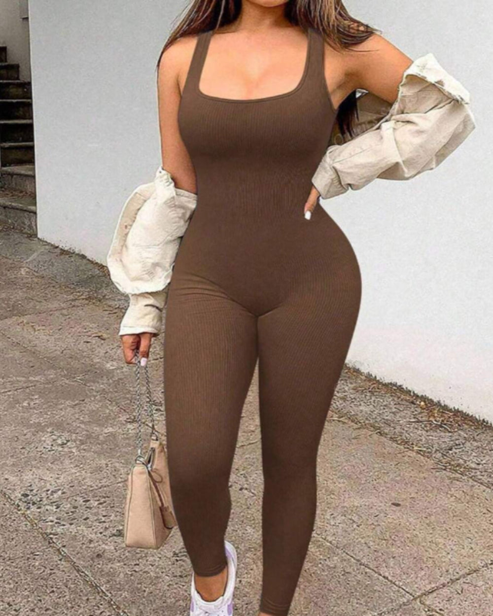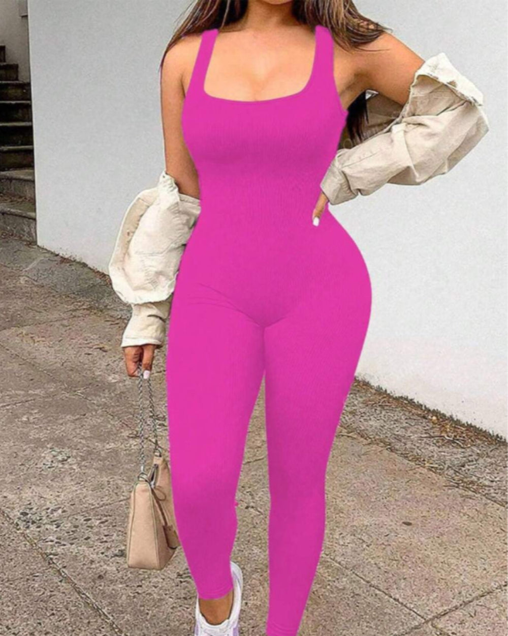 Streetwear Looks: The minimalist design and form-fitting silhouette make this jumpsuit a perfect base for trendy street style. Pair with sneakers and jacket for a stylish yet comfortable outfit.