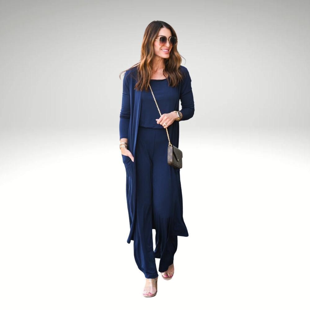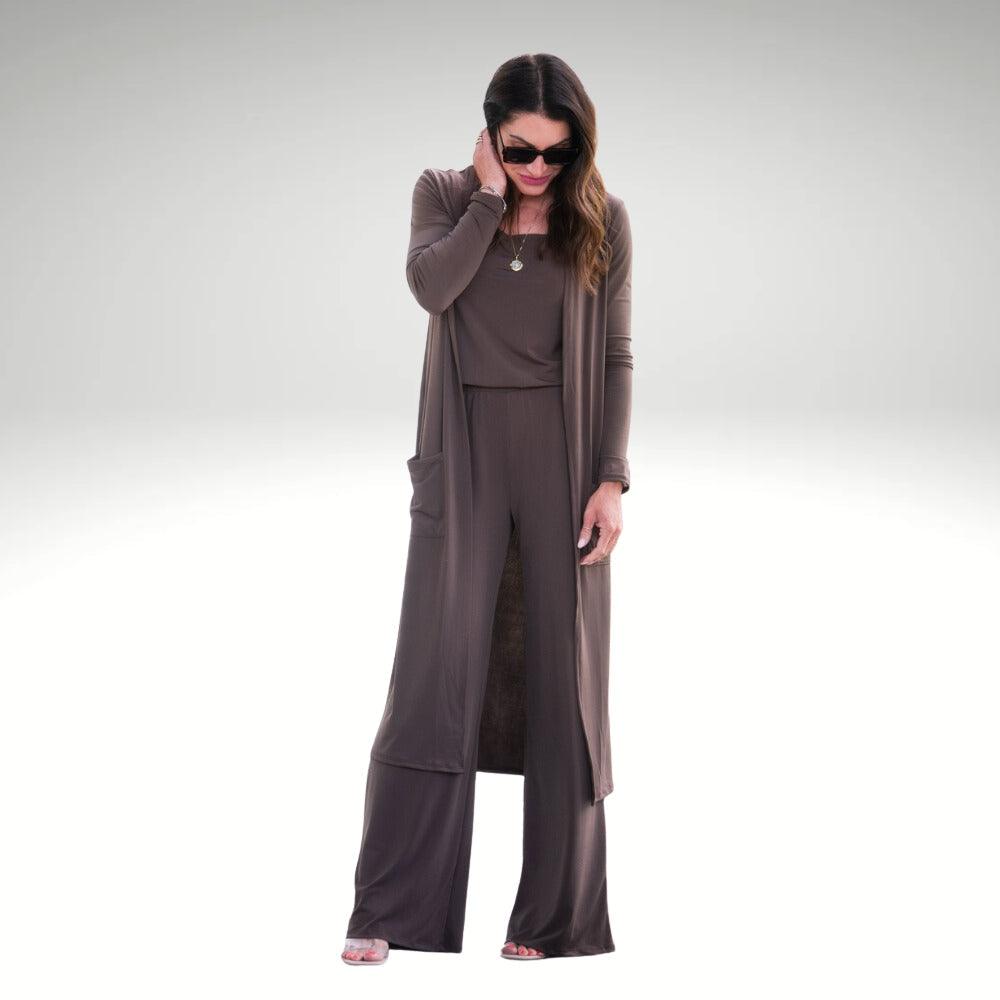 This outfit includes a long open-front cardigan, a square-neck tank top, and relaxed wide-leg pants. Each piece is thoughtfully designed to be worn together or individually. With soft ribbed fabric, a clean silhouette, and easy-care qualities, this set ensures a smooth dressing experience from morning to evening.