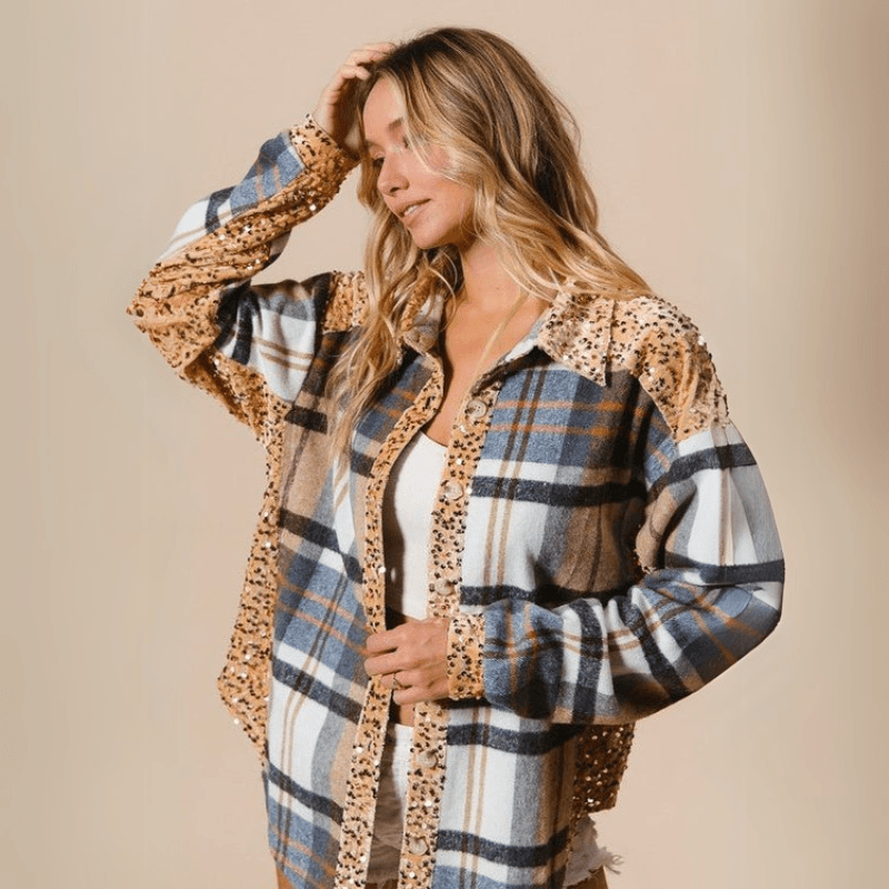 The sequin plaid shacket is a bold take on classic outerwear. Designed to combine function and fashion, this piece brings together a timeless plaid pattern and shimmering sequin embellishments. Whether you’re layering for a cool evening or planning a standout casual look, this curved hem shacket gives you a polished finish and visual interest in one effortless move.