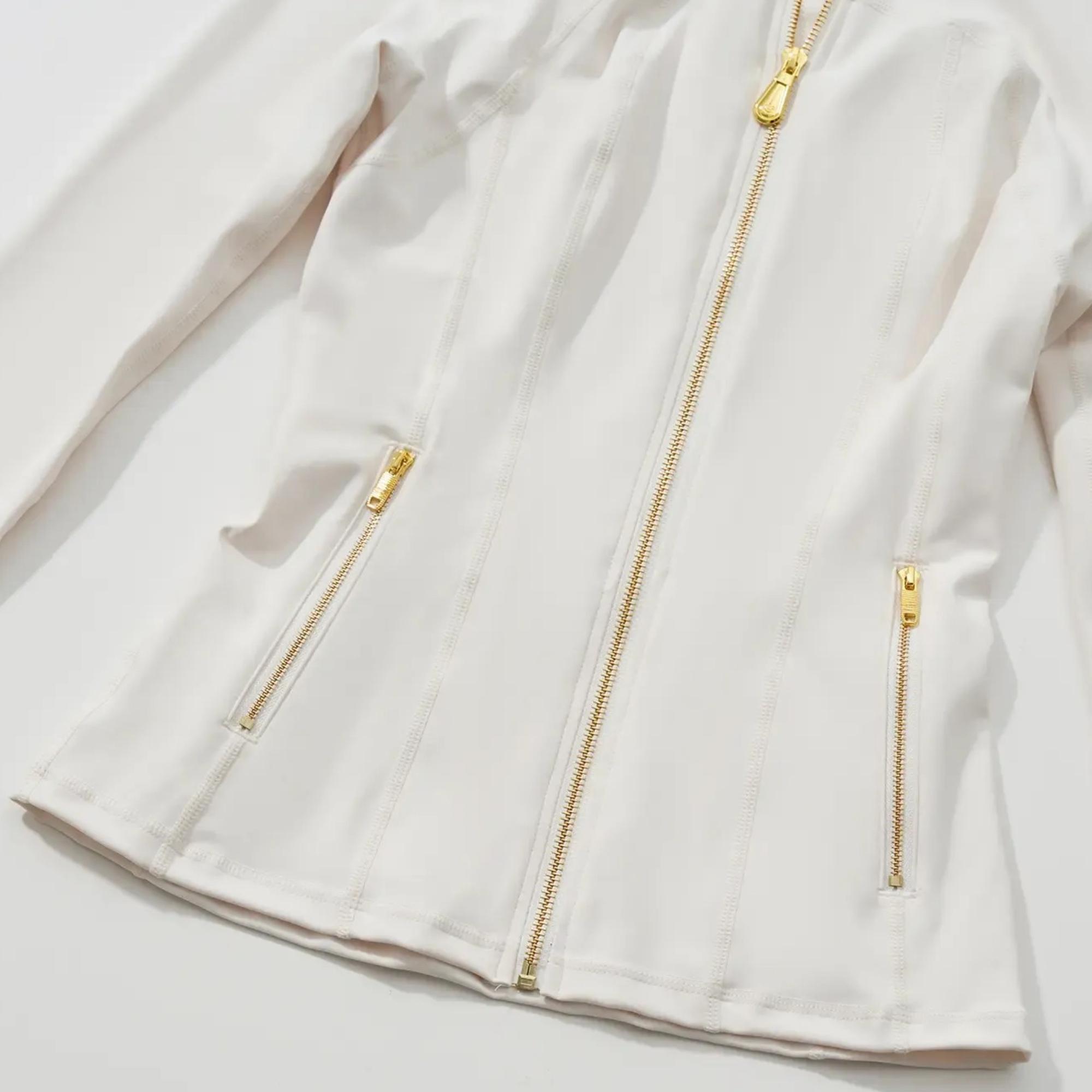 The design features a deep black color palette by contrasting golden zipper accents. These details add a refined look while maintaining a simple overall look. The jacket includes thumbhole sleeves for added functionality, while the overall construction ensures a smooth transition from active routines to casual settings.