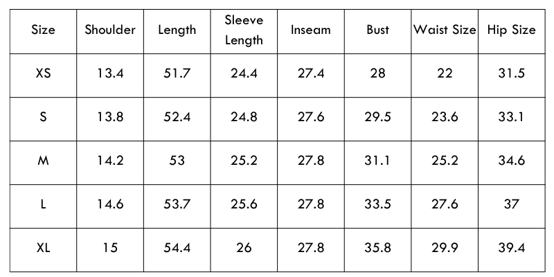 Size Chart (inches):