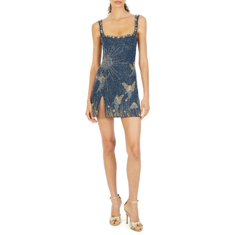 The celestial design and double slit structure make this mini dress a rare find in a sea of generic partywear.