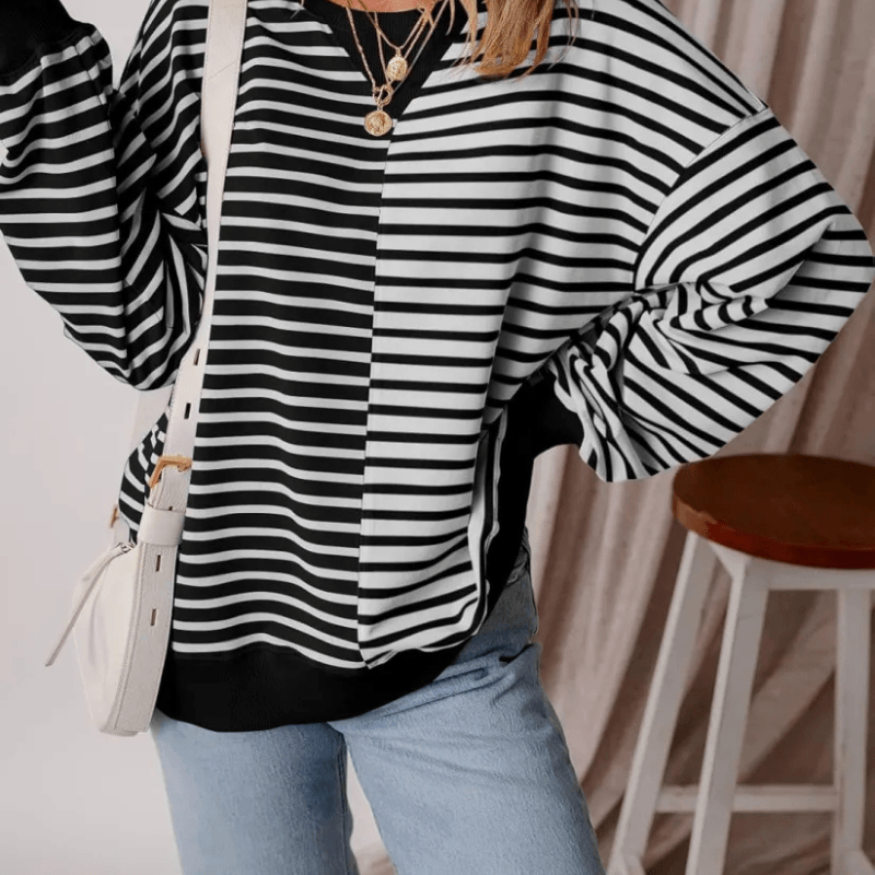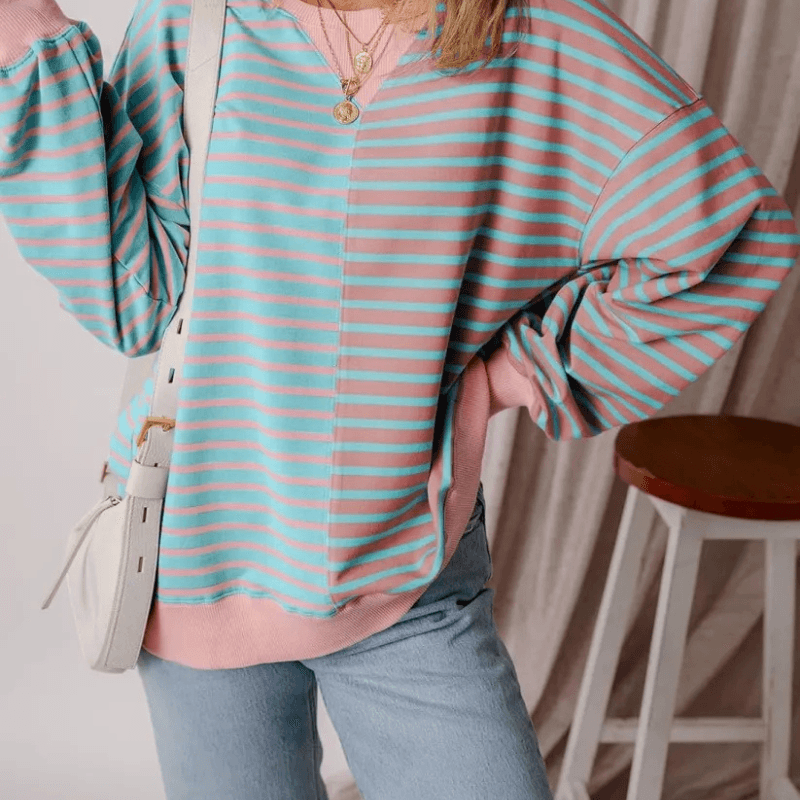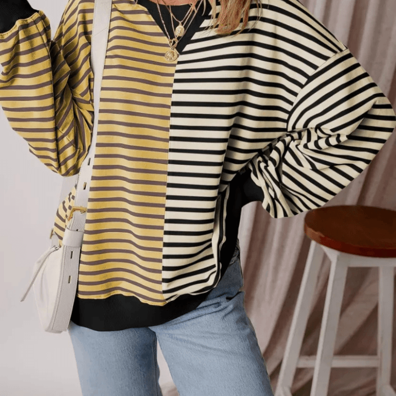 The striped design sweater is the perfect blend of modern casual and timeless comfort. It’s an essential part of your cool weather wardrobe, offering endless styling options and all-day ease. Whether you're stepping out or staying in, this sweater offers a flattering shape, cozy texture, and classic appeal that will keep you coming back to it season after season.