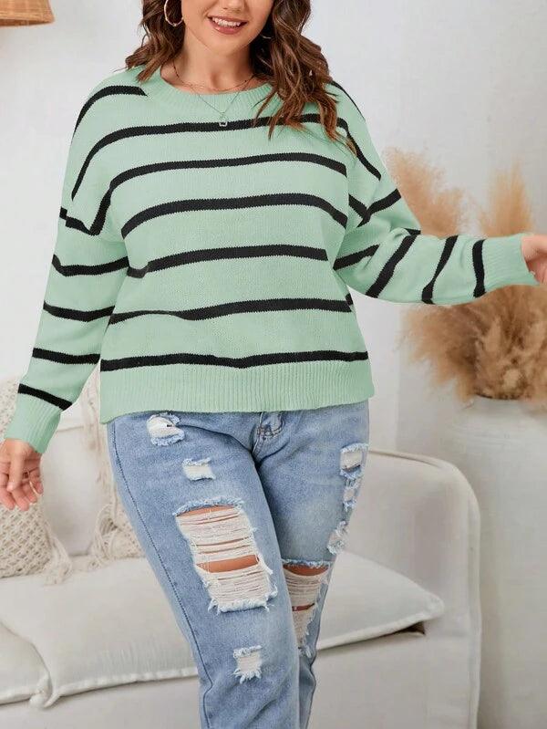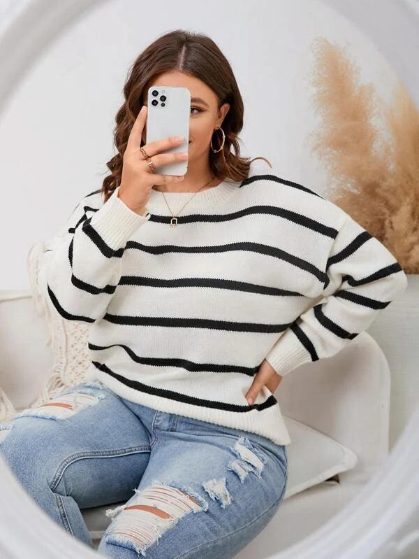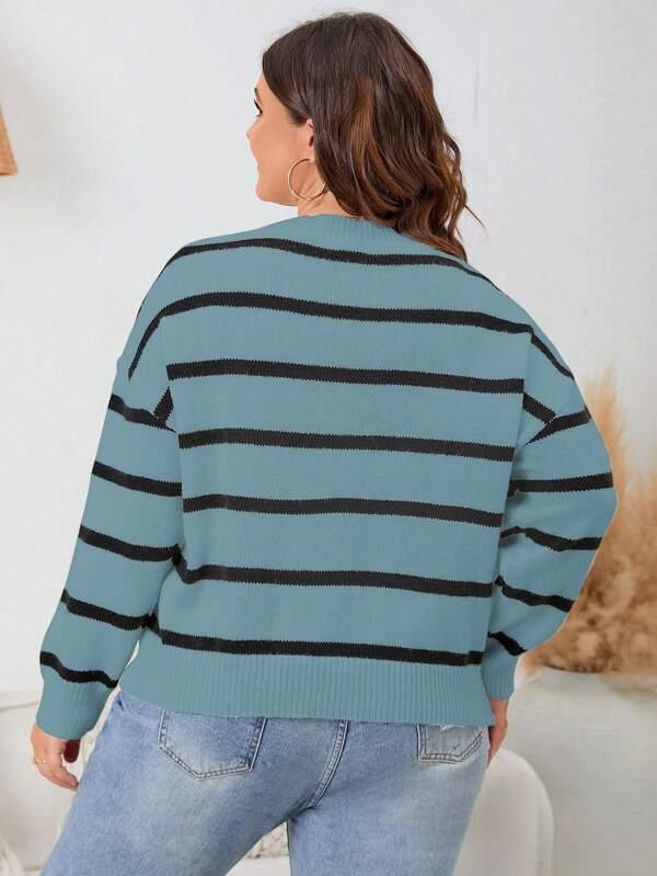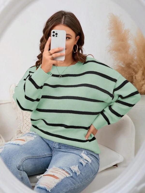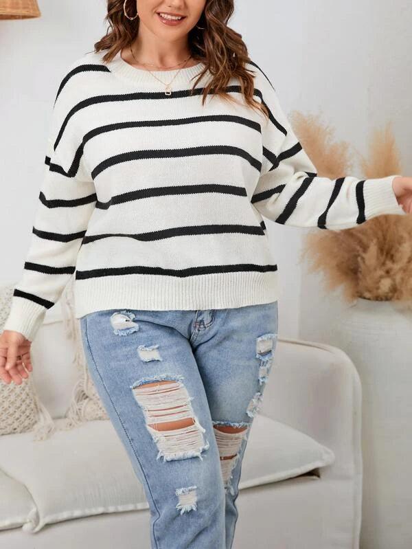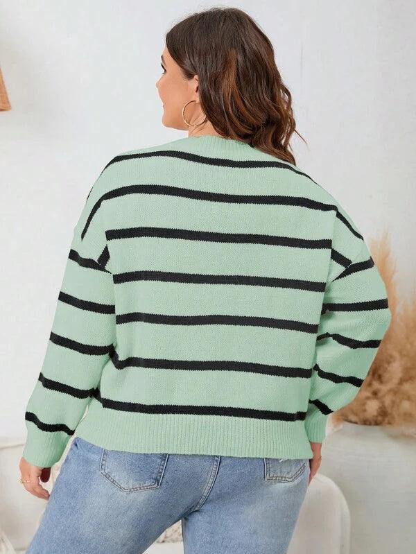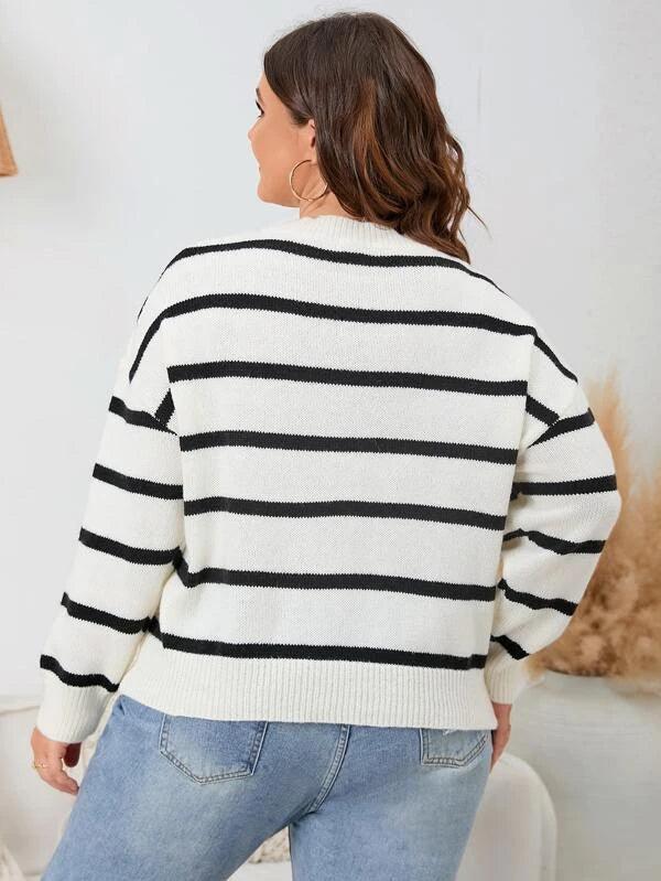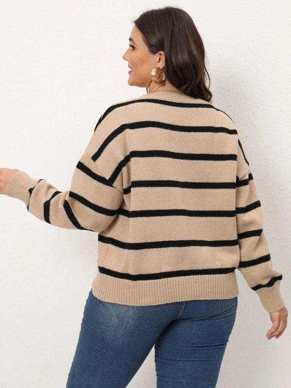 Worn on its own or over a lightweight inner layer, the sweater offers structured coverage without excessive weight. The pattern features medium-width striping, creating dimension across the fabric. From weekend errands to casual office settings, the silhouette fits seamlessly into simple wardrobes.