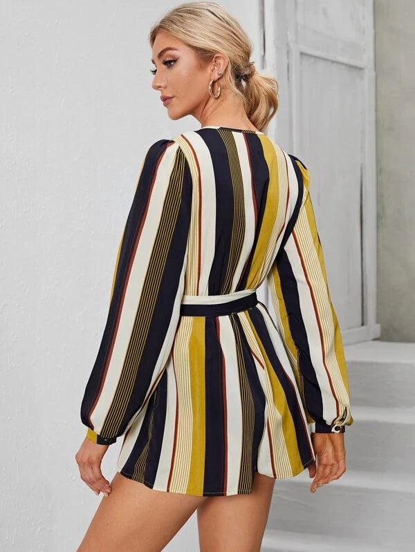 The Striped Print With Belt Patterned Jumpsuit is a stylish and trendy outfit perfect for any occasion. The jumpsuit features a striped pattern that creates a chic and sophisticated look. It has a shirt type and lace-up details, adding a playful touch to the overall design. The length is short, making it a great option for warmer weather, and the fit type is regular, providing a comfortable and relaxed fit. The neckline is a V-neck, and the sleeves are long with bishop sleeves, creating an elegant and feminine silhouette. The jumpsuit comes with a belt that cinches at the waist, creating a flattering shape that accentuates the figure.
