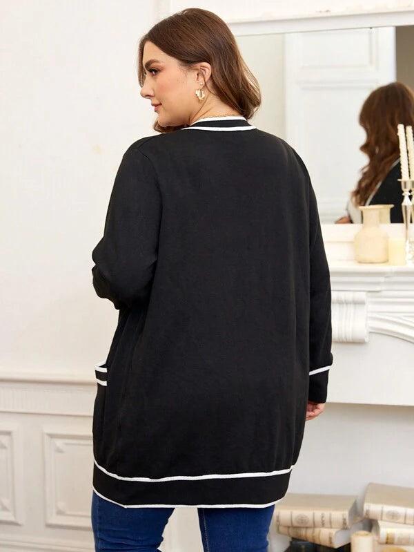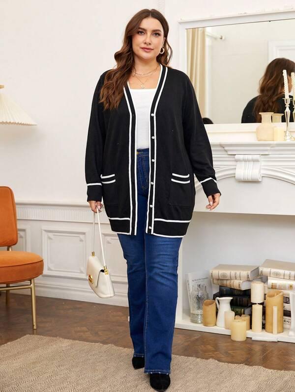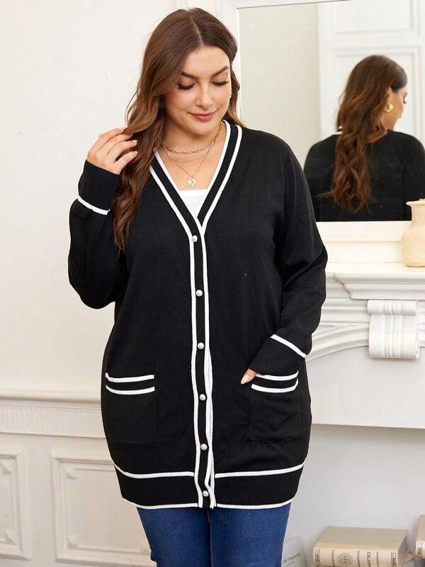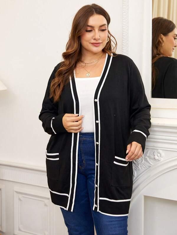 The striped trim pocket cardigan blends shape with ease. Its knitwear structure pairs well with casual daily outfits. From the button front cardigan to the dual pocket cardigan design each detail supports comfort. Use this midi length sweater during late fall or chilly days. The loose fit knitwear offers room without heaviness. It works well for home tasks or daily trips. Crafted from polyester knit fabric it keeps shape and color. Add this casual style sweater to your layer-ready wardrobe.
