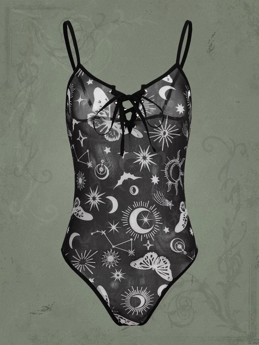 Sun And Moon Graphic Mesh Cami Bodysuit