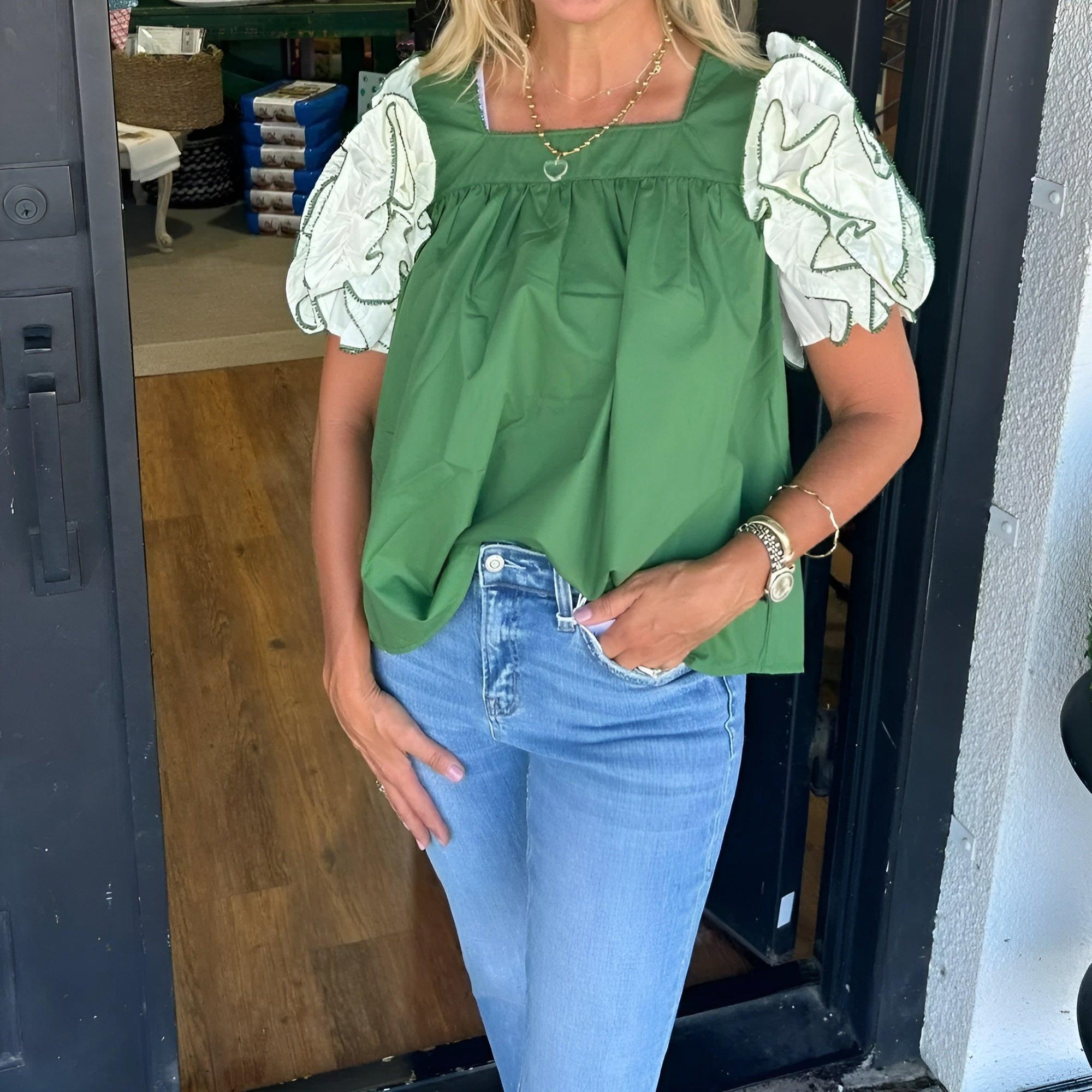 Pattern and Texture: The fabric has a smooth texture with a slight sheen, while the ruffle sleeves add a dimensional texture to the overall design.