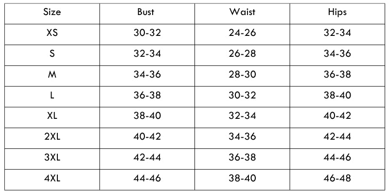 Size Chart (inches):