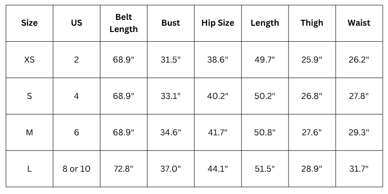 Size Chart in Inches: