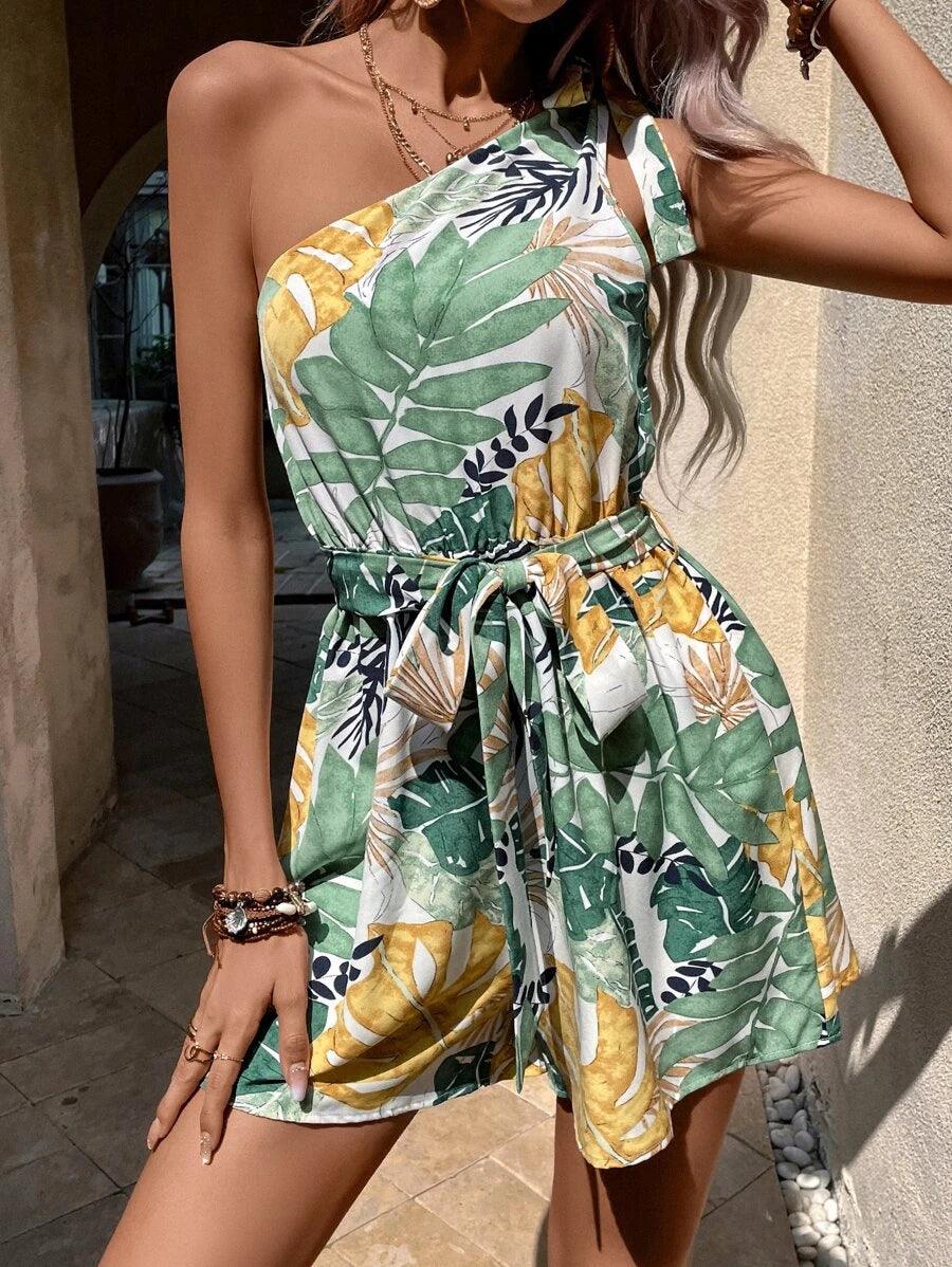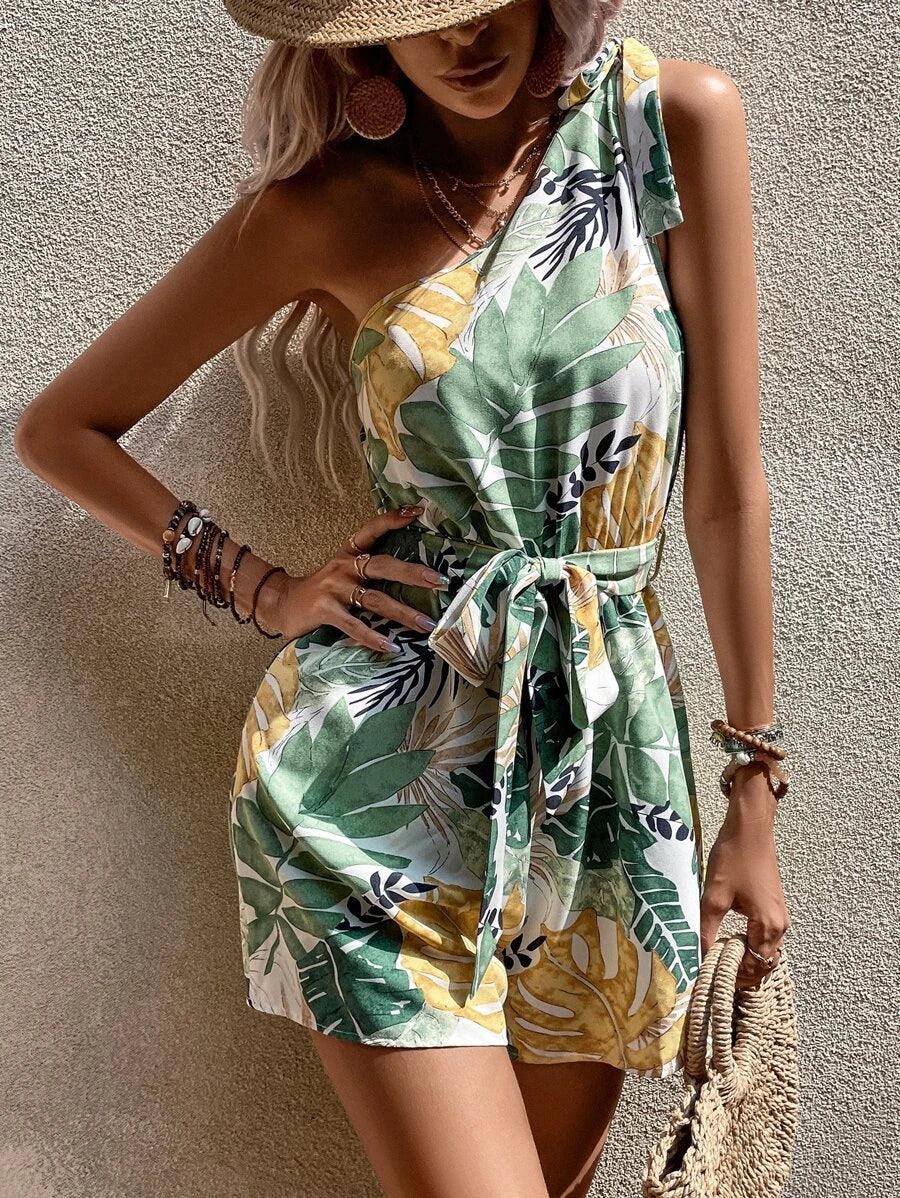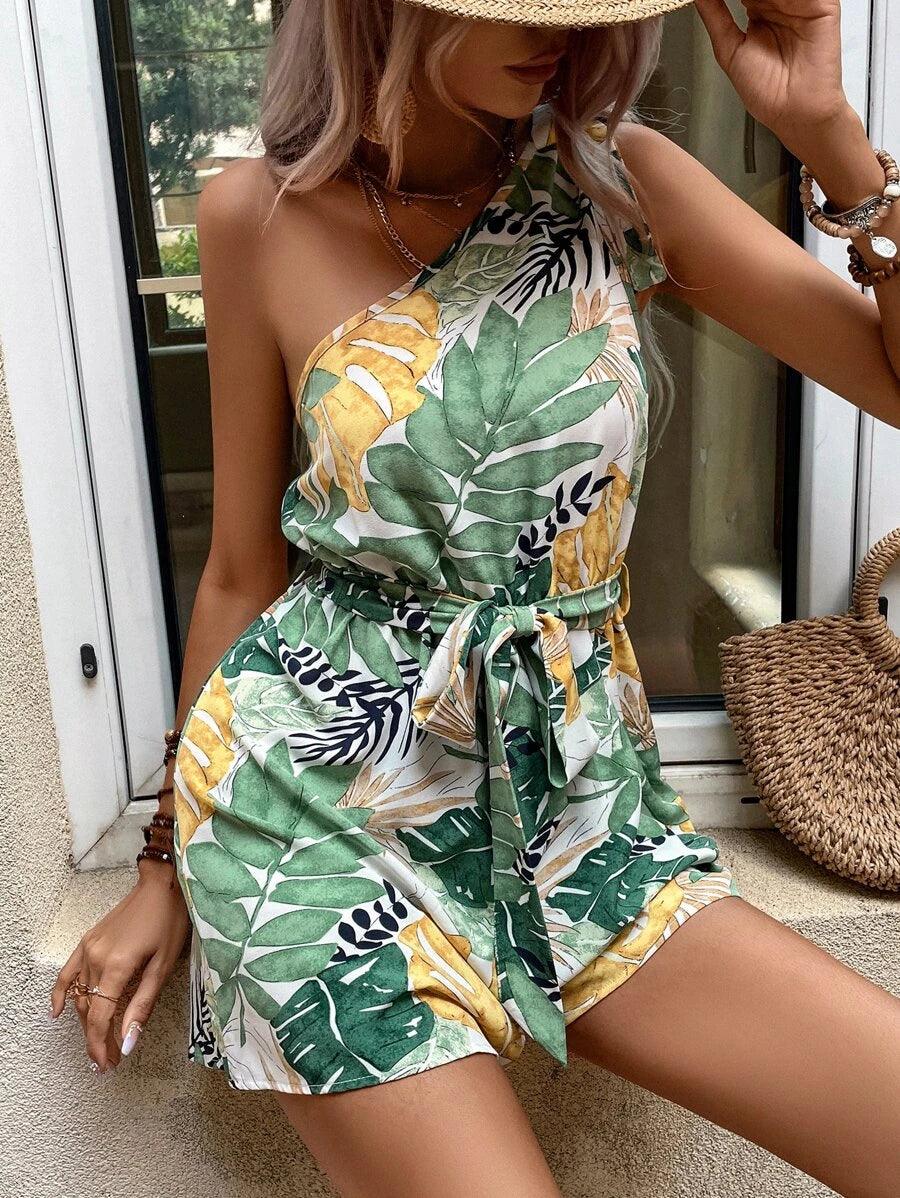 Experience the ultimate in luxury and sophistication with this tropical-print one-shoulder belted romper. Crafted from a lightweight woven fabric with bold coloring and fine detailing in a bold asymmetrical neck design, it makes a statement in any setting. Boasting a figure-flattering silhouette and high waist, it exudes a timelessly elegant boho style.