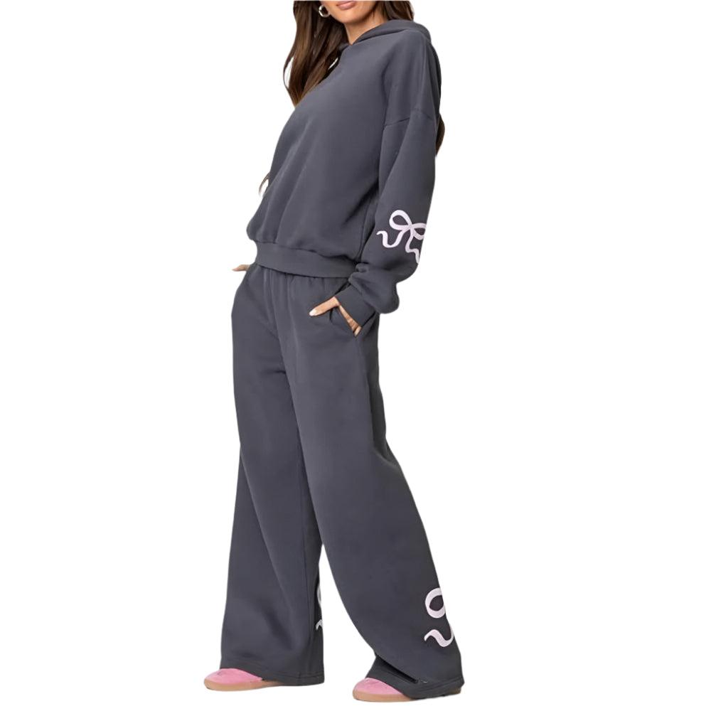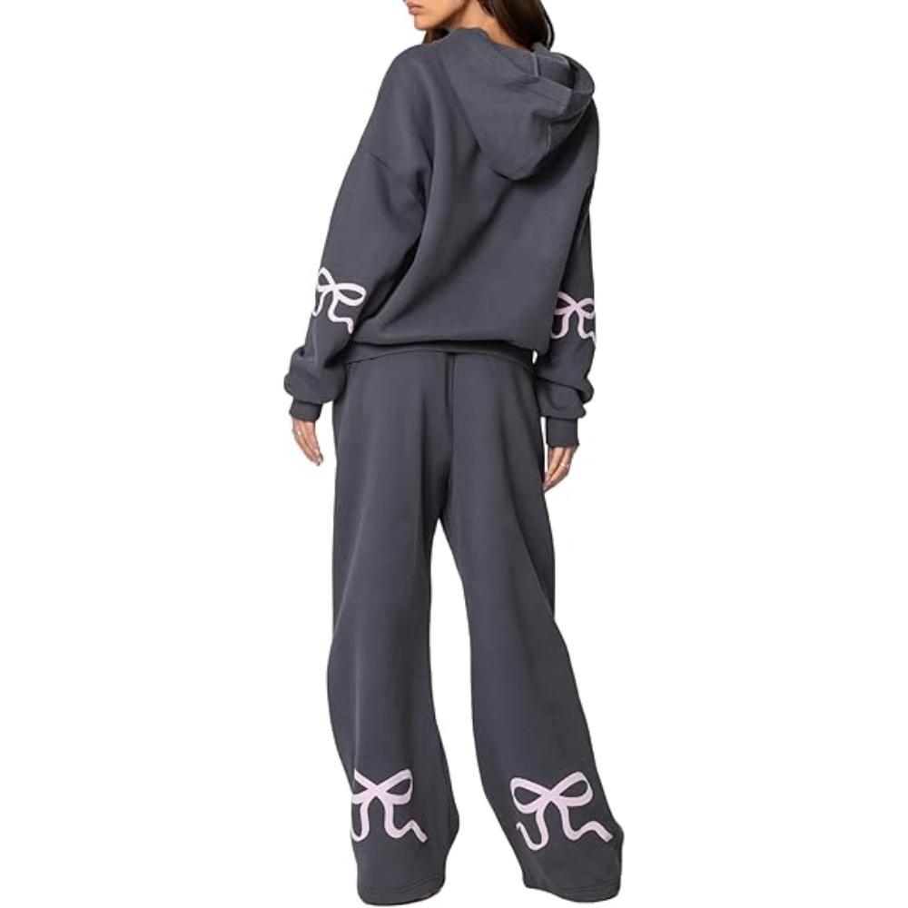 The bow print adds subtle flair, making it a standout among typical lounge sets. This bow print hoodie set makes staying home stylish again—or turns a coffee run into a low-effort fashion moment.