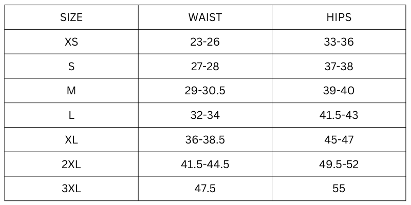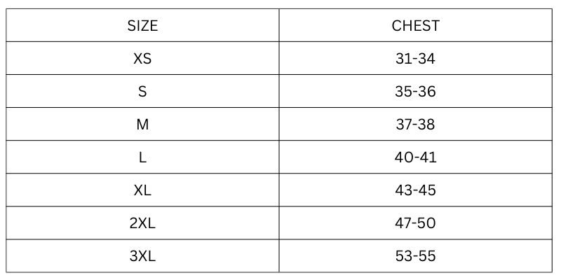 Size Chart in Inches: