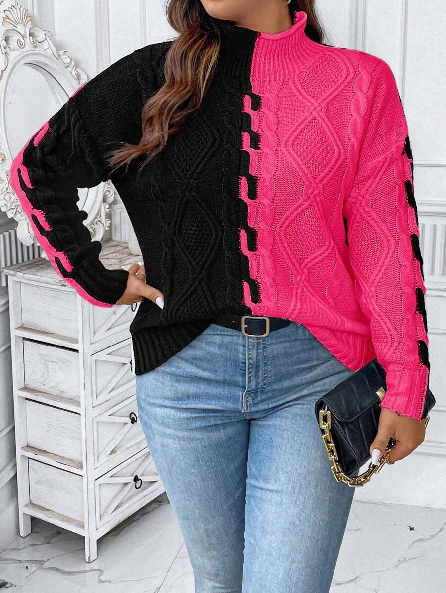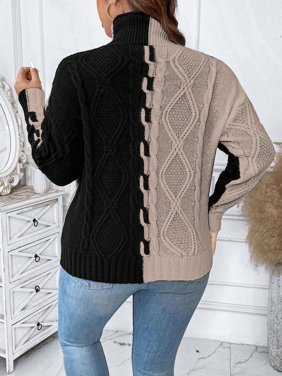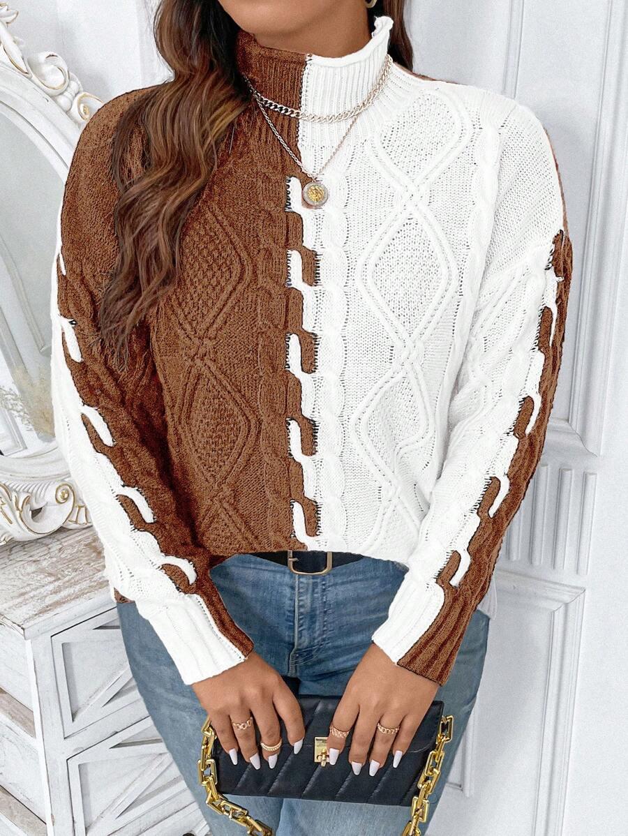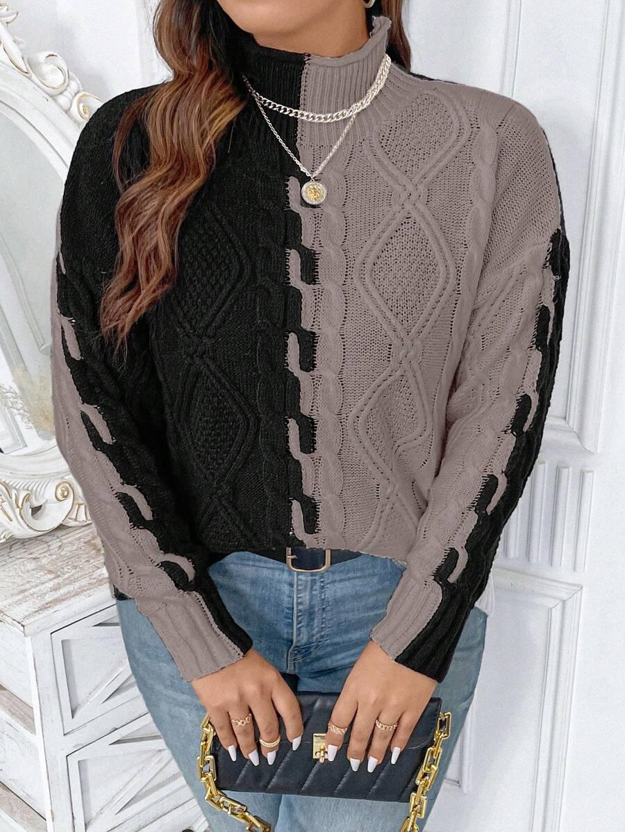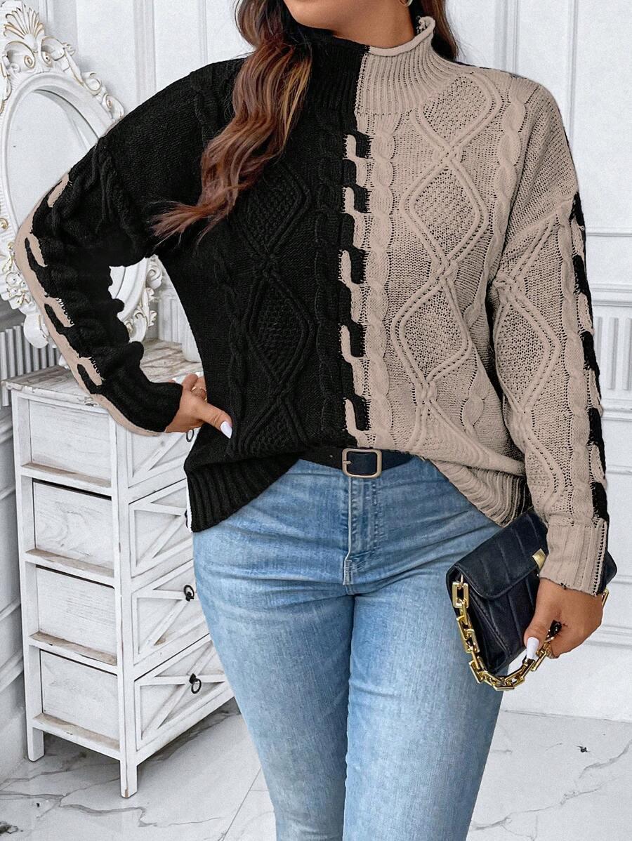 The two tone cable sweater blends classic patterns with modern comfort. Its colorblock knit top creates a bold yet simple look. This acrylic pullover sweater features a structured stand collar and long drop shoulder knitwear sleeves. Designed for ease and shape this piece offers reliable casual style. From early fall to late chill this casual knit style fits many wardrobes. Crafted with non stretch fabric for a lasting shape. The pullover cable knit structure supports effortless matching in all seasons.