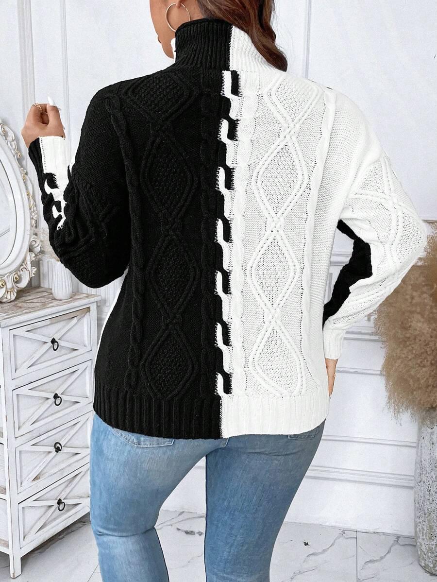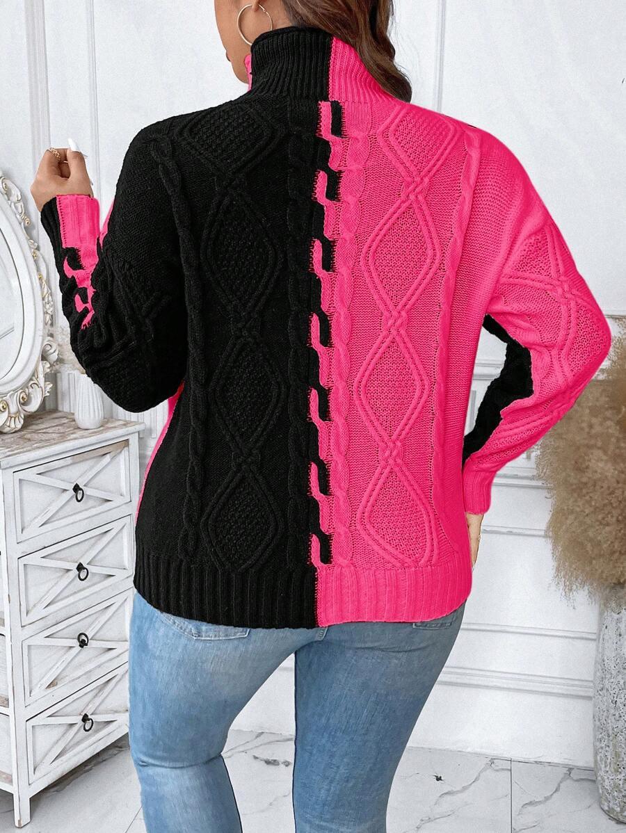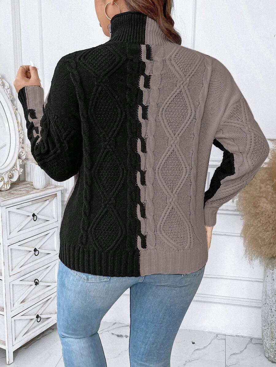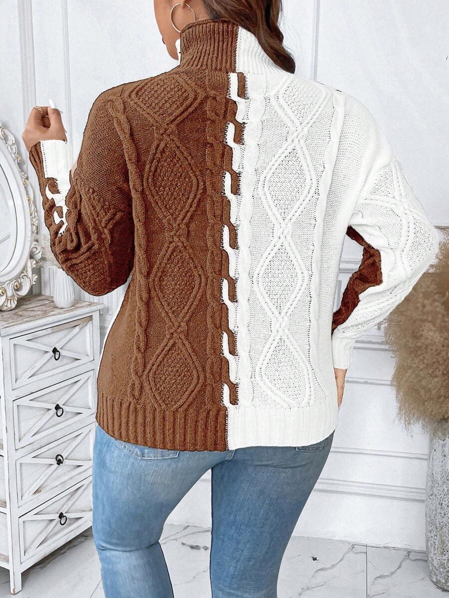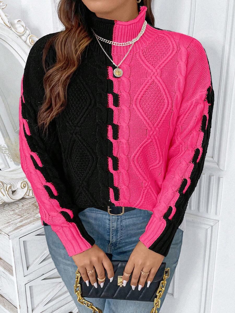 The two tone cable sweater blends classic patterns with modern comfort. Its colorblock knit top creates a bold yet simple look. This acrylic pullover sweater features a structured stand collar and long drop shoulder knitwear sleeves. Designed for ease and shape this piece offers reliable casual style. From early fall to late chill this casual knit style fits many wardrobes. Crafted with non stretch fabric for a lasting shape. The pullover cable knit structure supports effortless matching in all seasons.