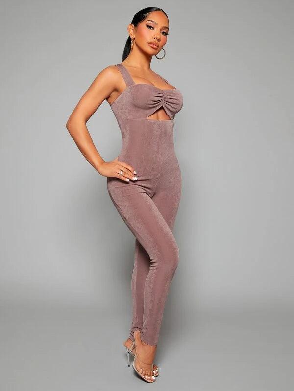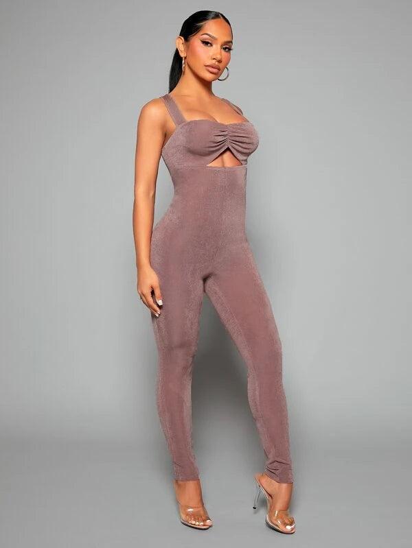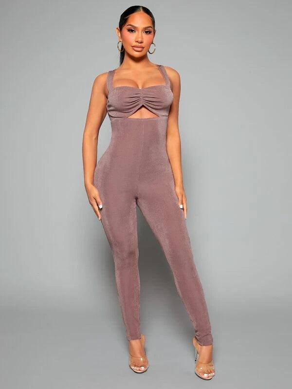 Unitard Cut Out Front Jumpsuit is a perfect combination of style and comfort. With a sleeveless design and a flattering strap neckline, this jumpsuit features a cut-out front and ruched detailing that adds a touch of flair to your outfit. Made with a slight stretch knitted fabric. The plain pattern ensures versatility, making it a great option for both casual and formal events.